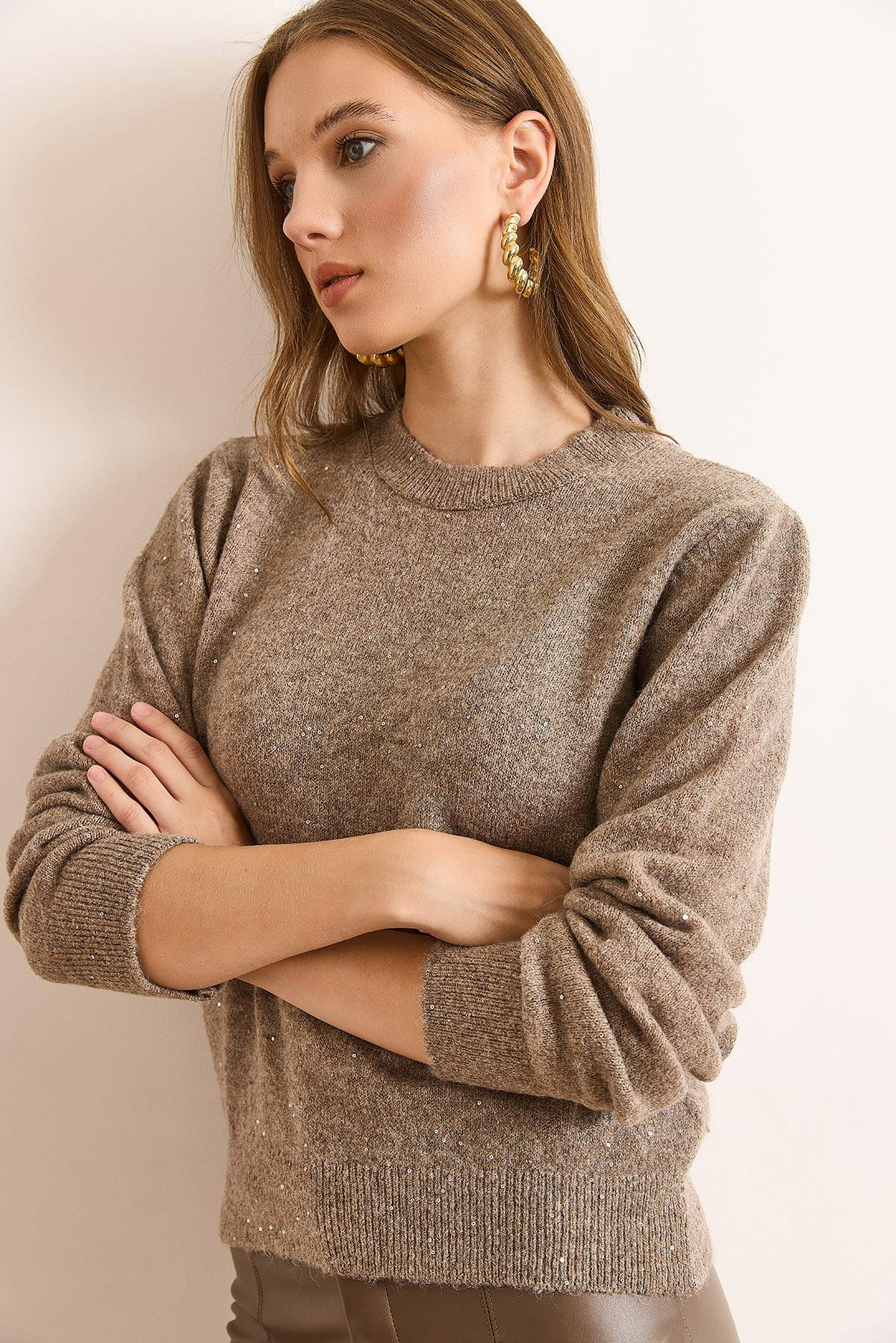 İpliği Pullu Yumuşak Dokulu Triko Kazak Vizon