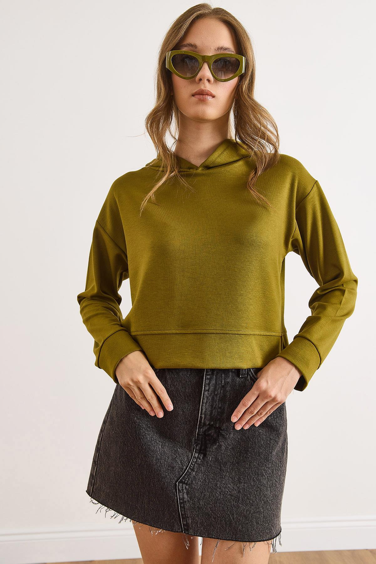 Kapüşonlu Yanı Yırtmaçlı Modal Tuşeli Bluz Yağ Yeşili (BLZ-19003128)