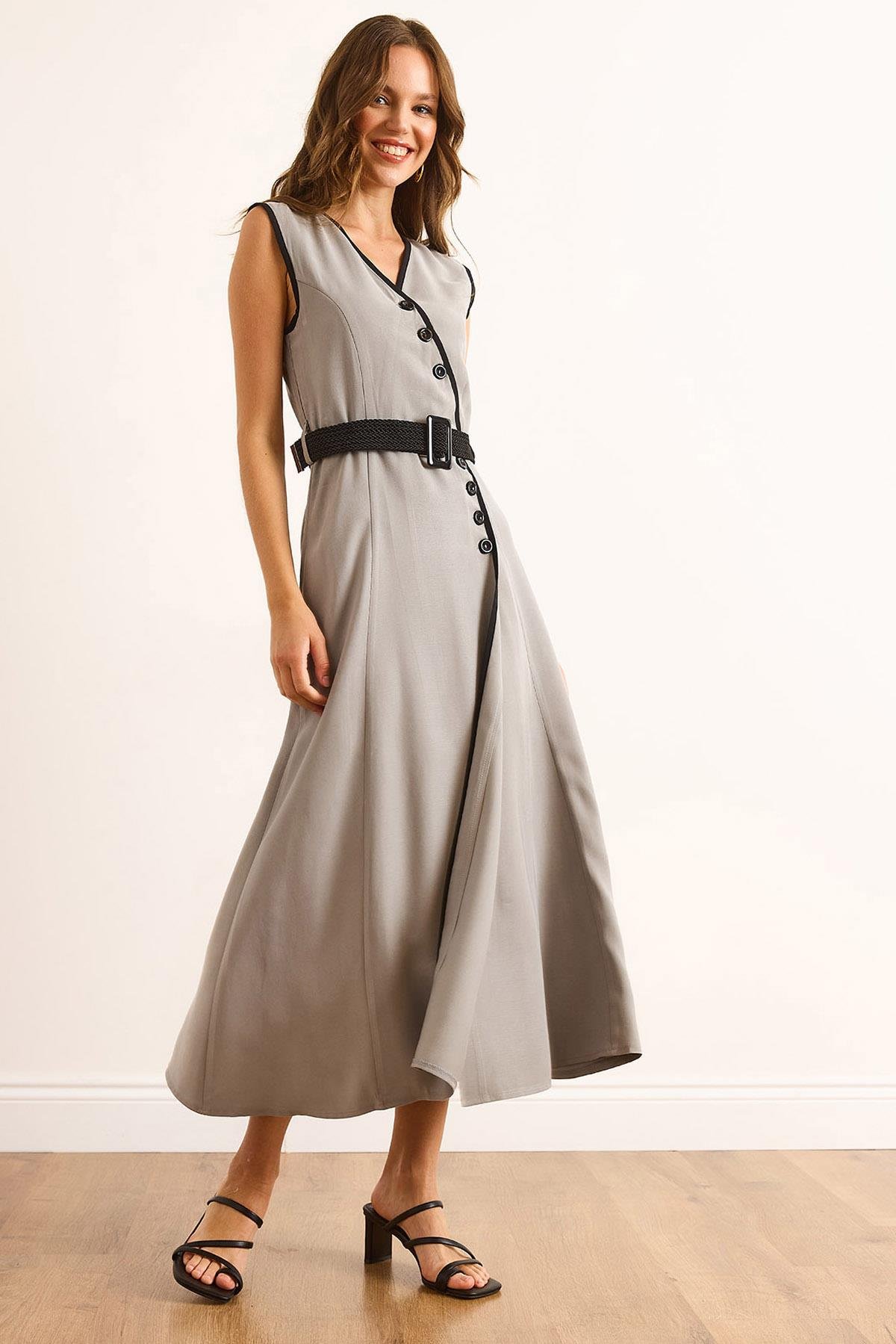 Kemerli Biye Detaylı Dökümlü Maksi Elbise Gri (ELB-19002528)