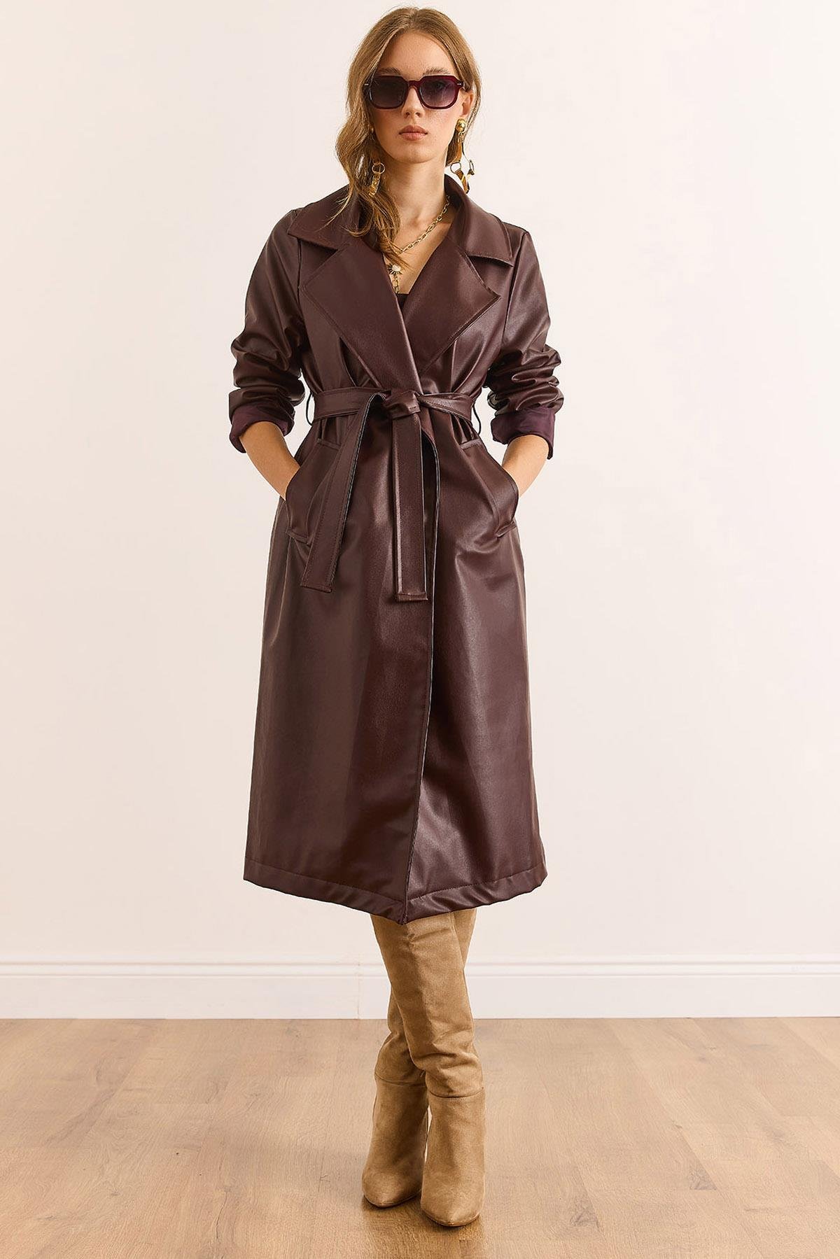 Kuşaklı Cepli Astarlı Deri Trençkot Bordo (TRC-00000009)