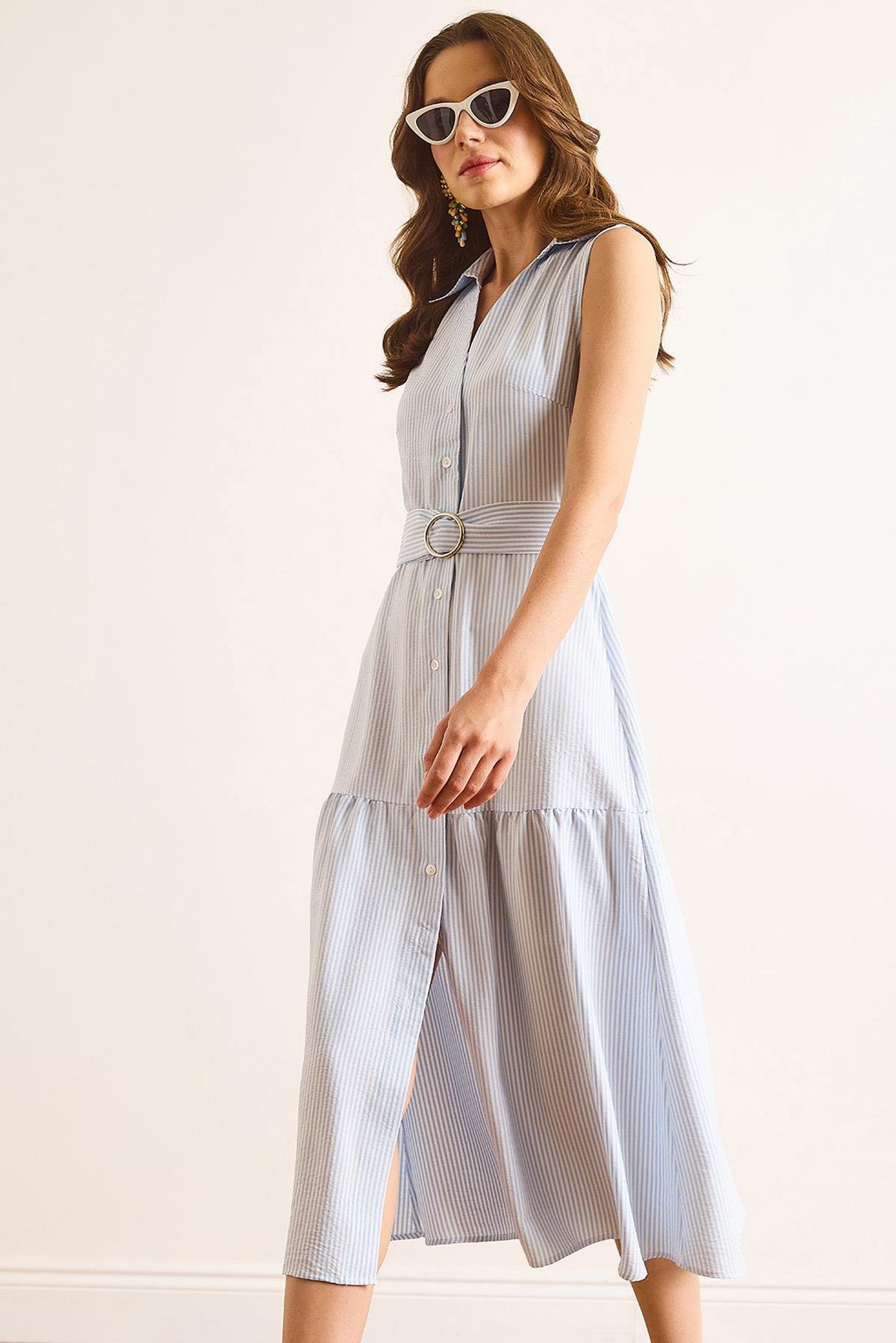 Kuşaklı Çizgili Düğmeli Maksi Elbise Mavi (ELB-19002510)