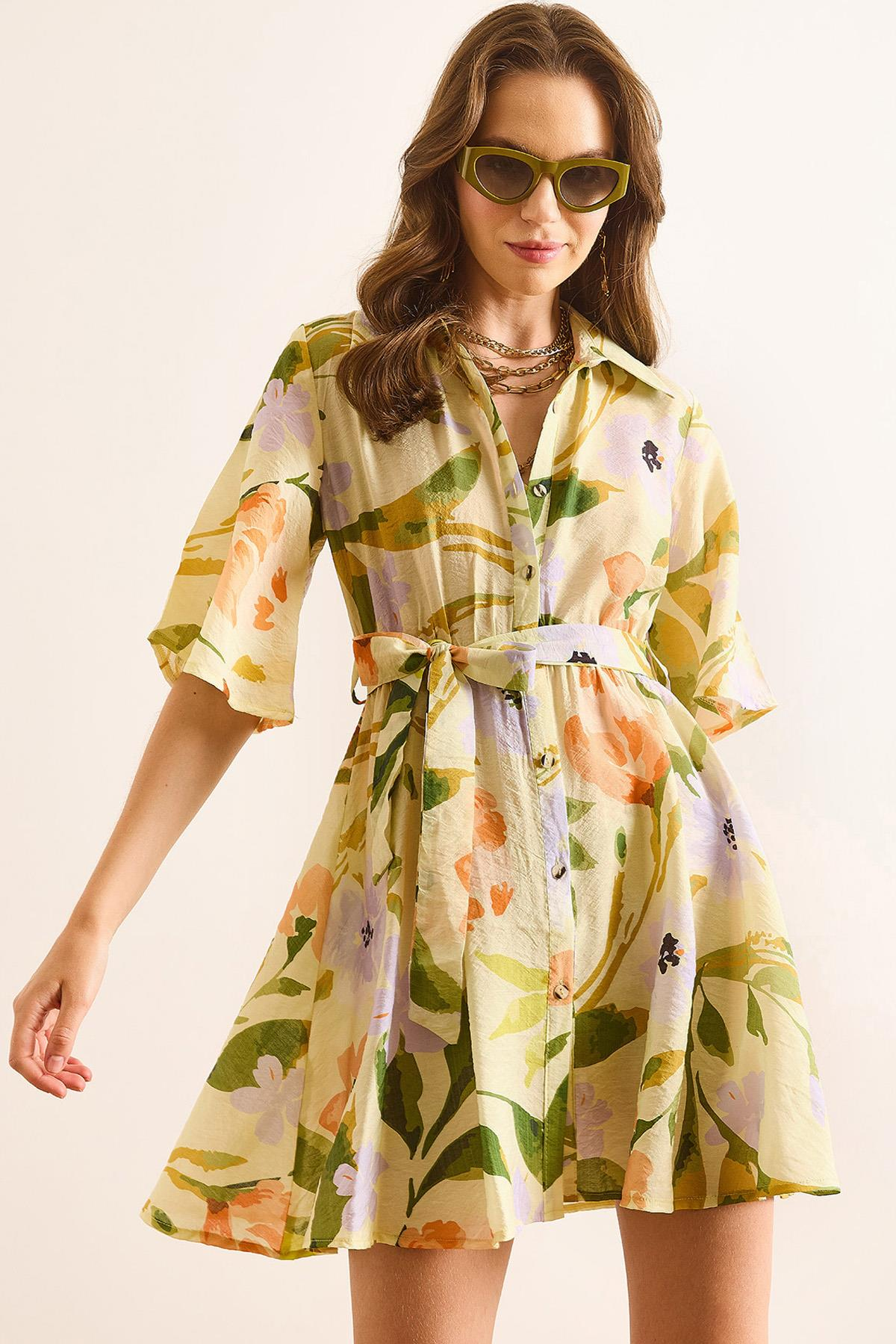 Kuşaklı Desenli Mini Gömlek Elbise Yeşil (ELB-19002507)