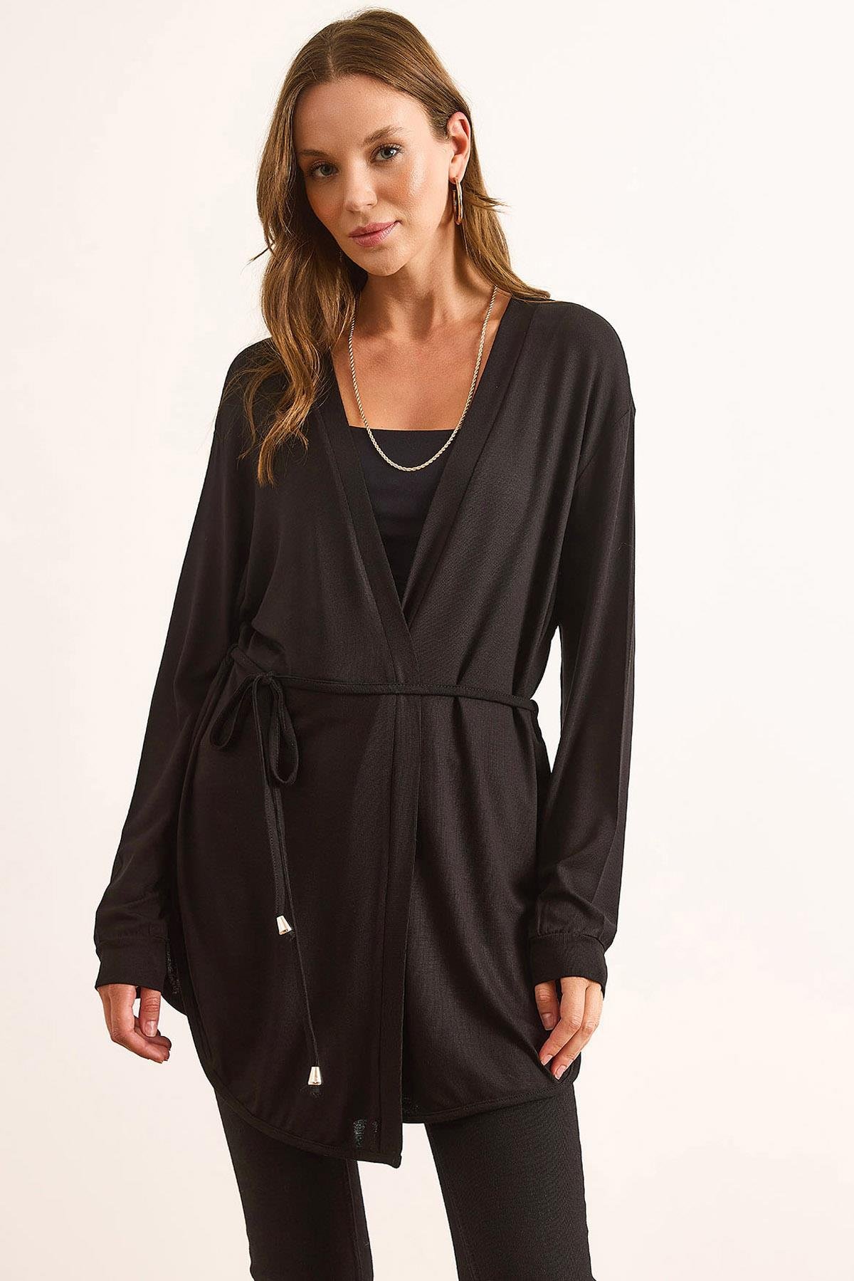 Kuşaklı İnce Mevsimlik Hırka Siyah