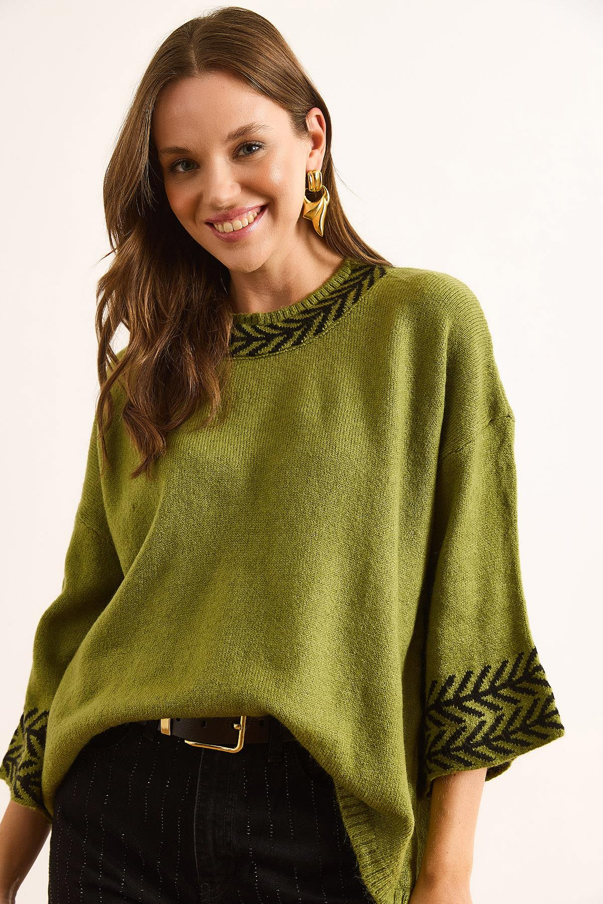 Manşet Kol Detaylı Truvakar Triko Kazak Yağ Yeşili (KZK-19000975)