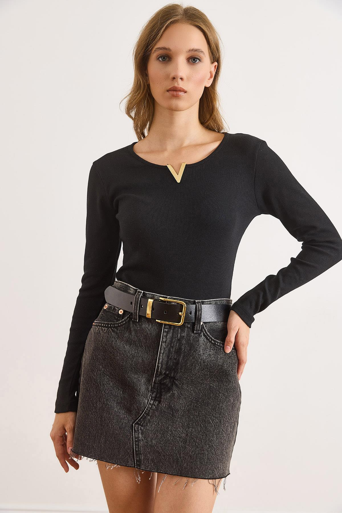 Metal V Detaylı Esnek Kaşkorse Bluz Siyah (BLZ-19003129)