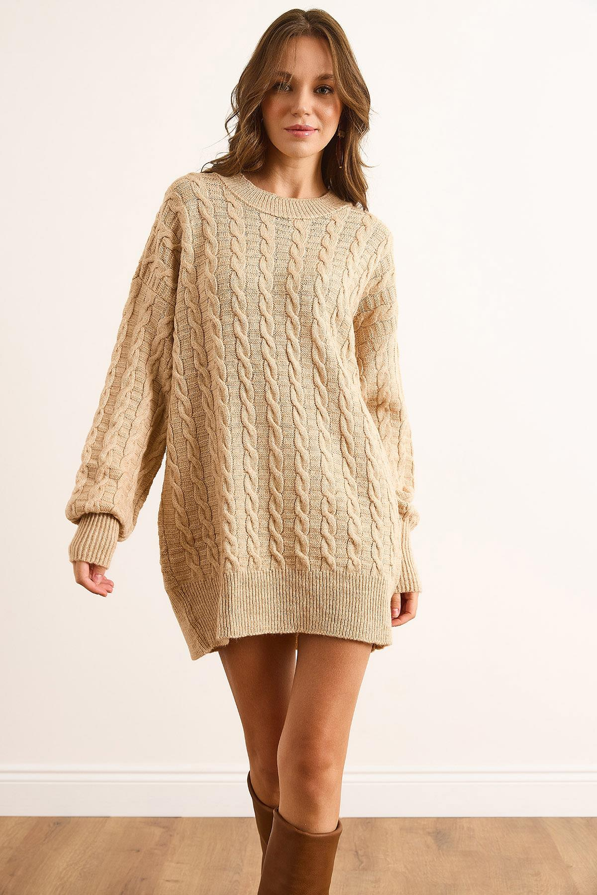 Minik Saç Örgülü Triko Tunik Elbise Bej