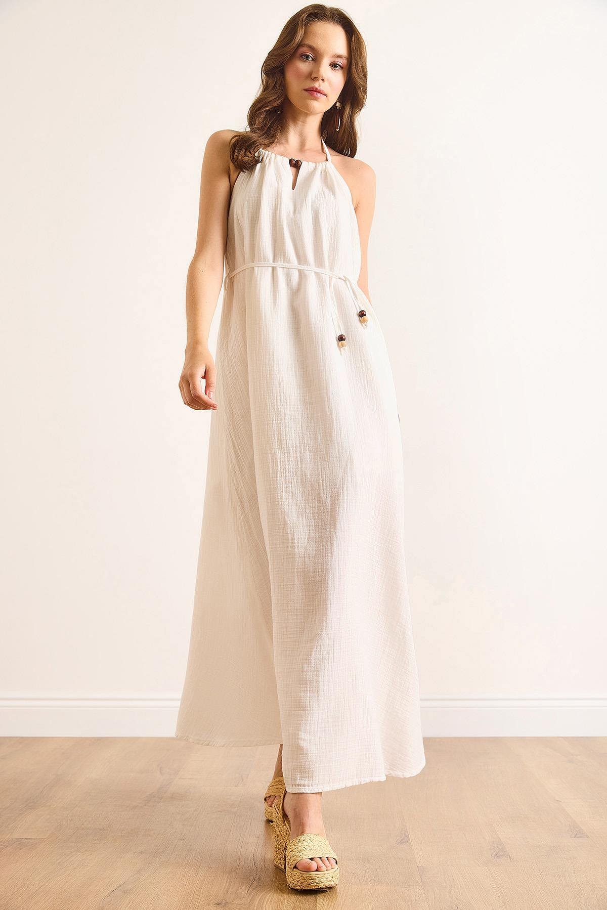 Müslin Astarlı Sırt Derin Dekolteli Maksi Elbise Beyaz (ELB-19002504)