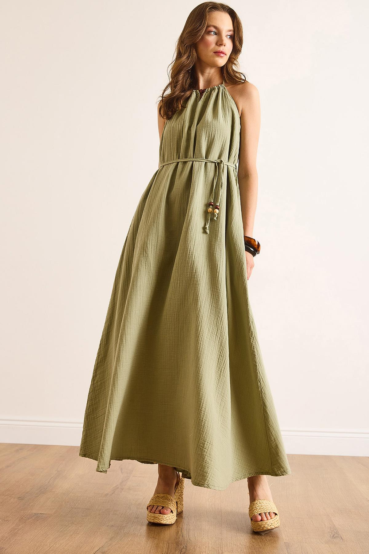 Müslin Astarlı Sırt Derin Dekolteli Maksi Elbise Haki (ELB-19002504)