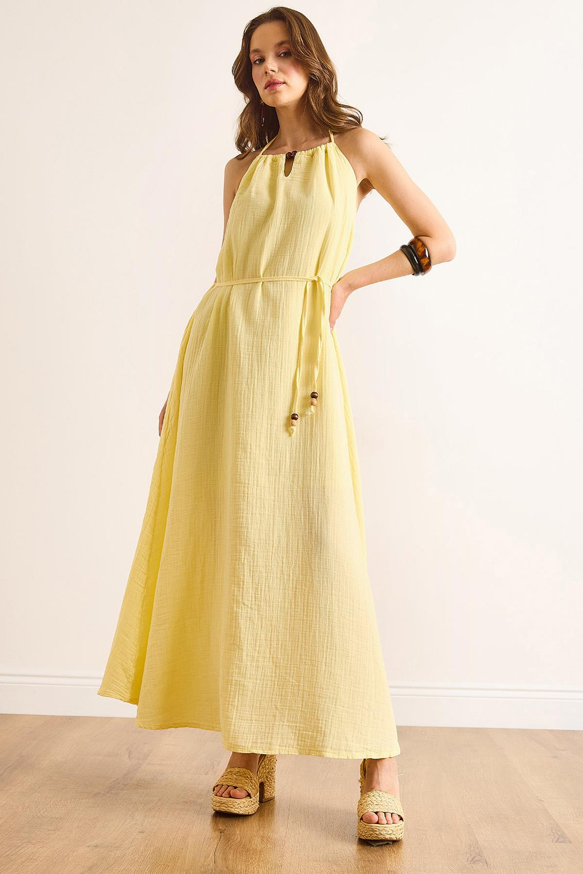Müslin Astarlı Sırt Derin Dekolteli Maksi Elbise Sarı (ELB-19002504)