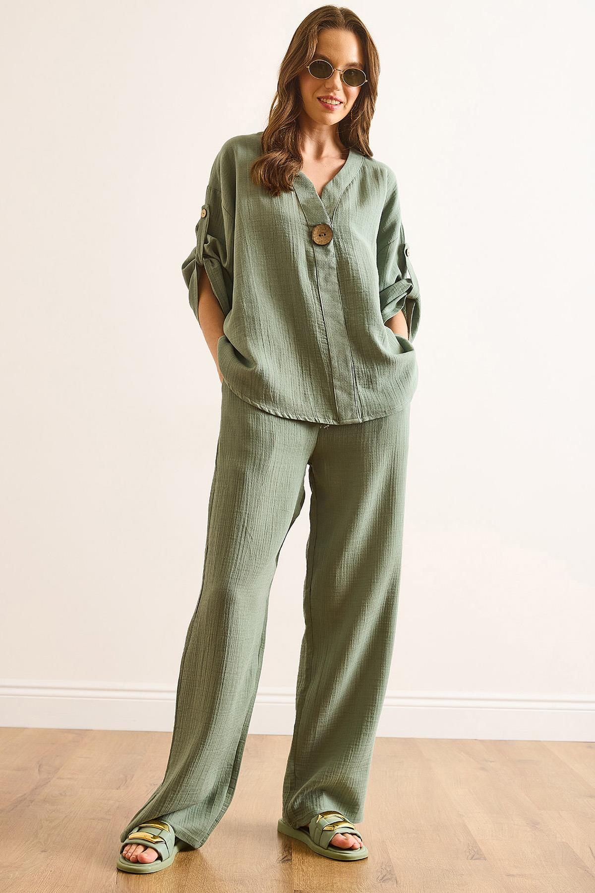 Müslin Düğme Detaylı Bluz Cepli Pantolon Takım Çağla Yeşili