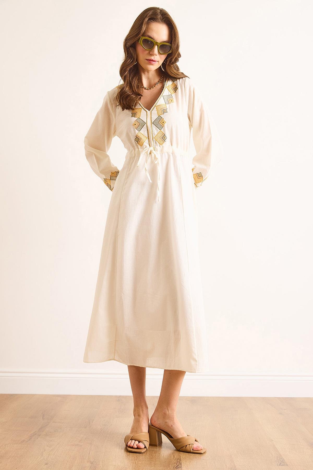 Nakış Detaylı Beli Bağcıklı Astarlı Maksi Elbise Ekru (ELB-19002516)