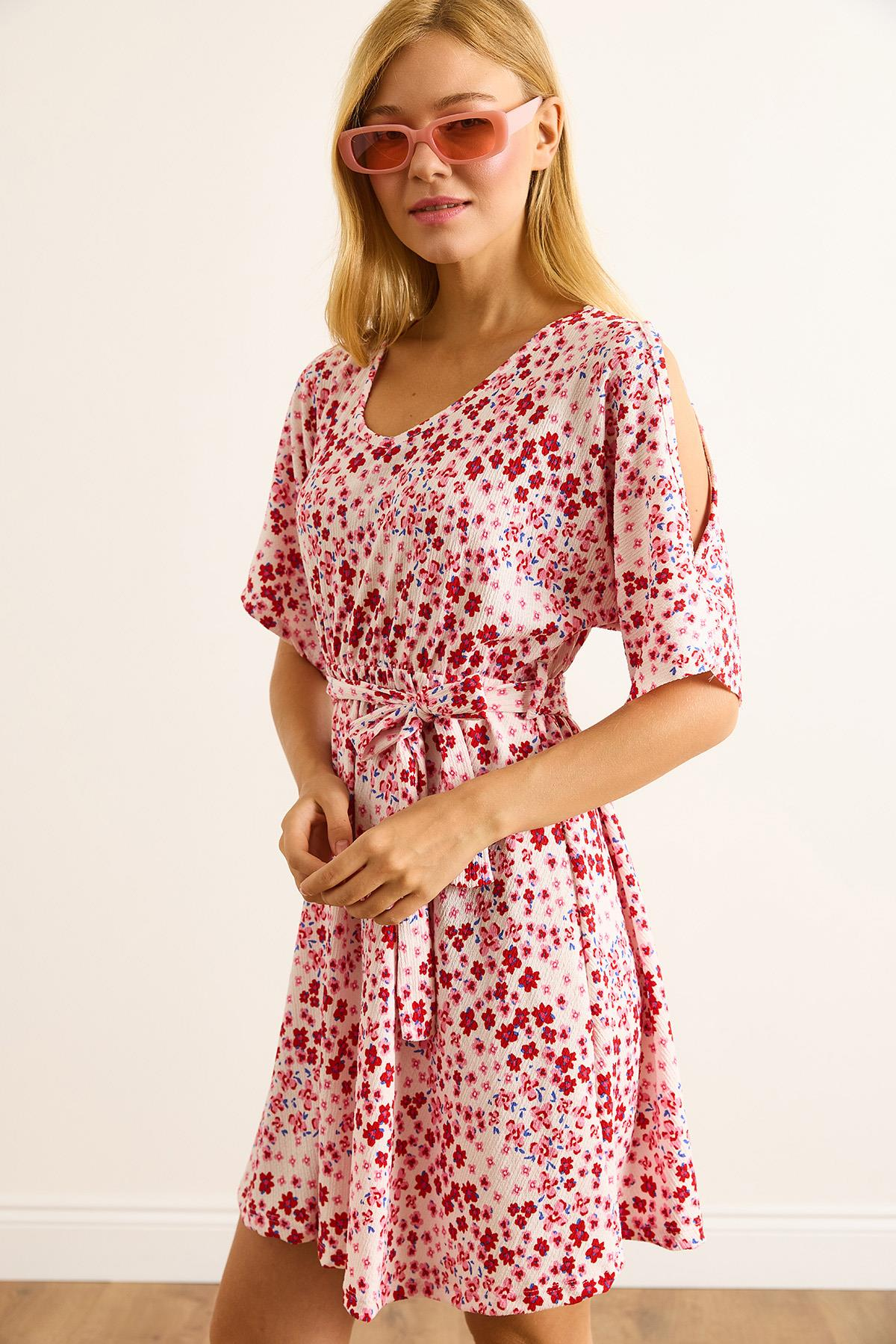 Omuz Dekolteli Beli Lastikli Kuşaklı Mini Elbise Ekru Pembe (ELB-19002177)
