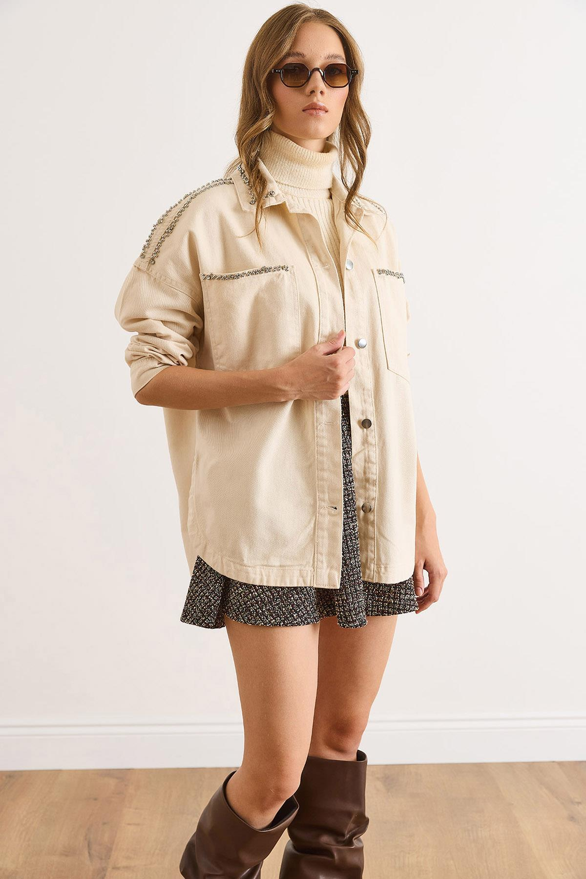 Omuzu Cepleri Taş Detaylı Pamuk Gabardin Ceket Taş (CKT-19000470)