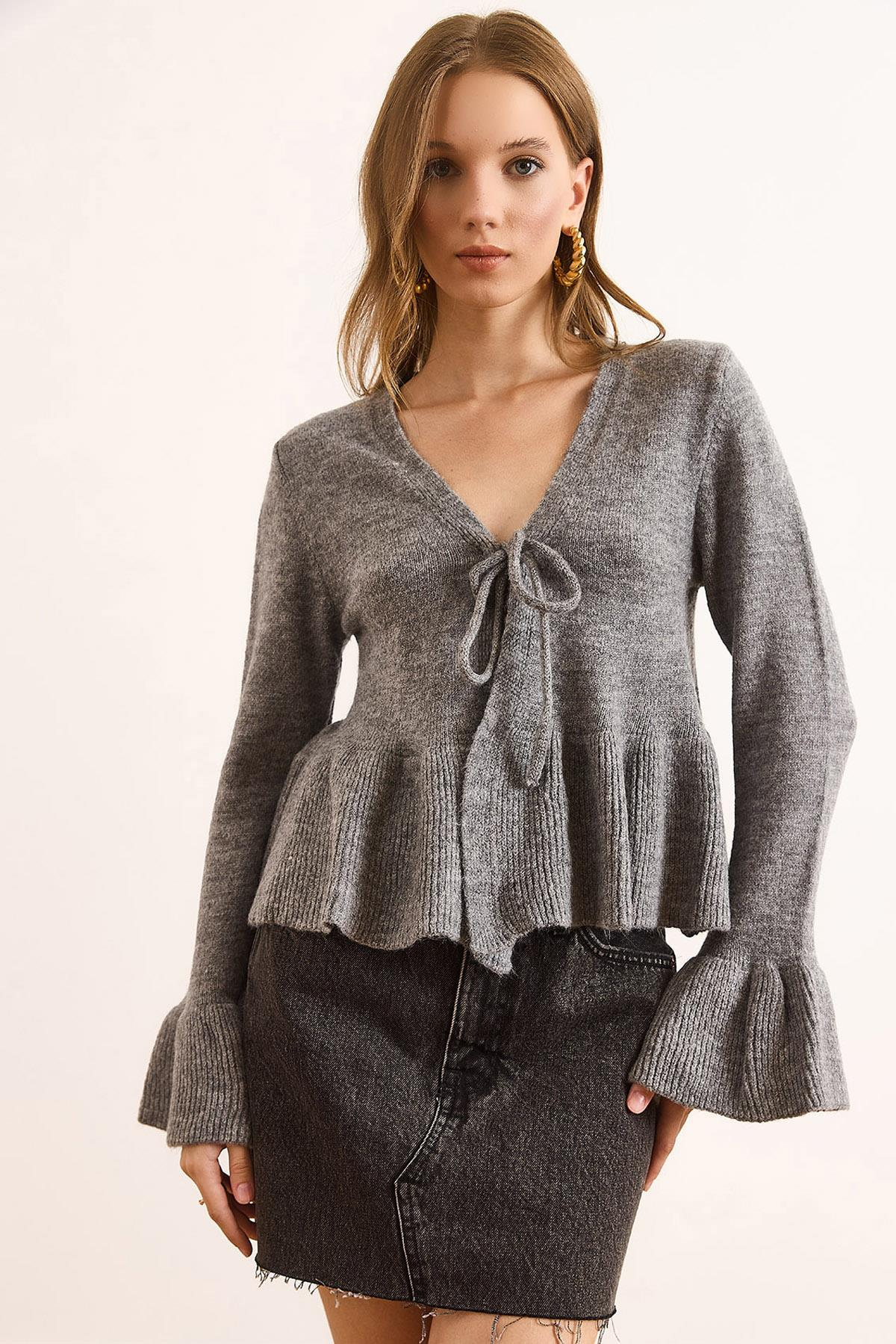 Önü Bağcıklı Yumuşak Dokulu İspanyol Kol Hırka Antrasit