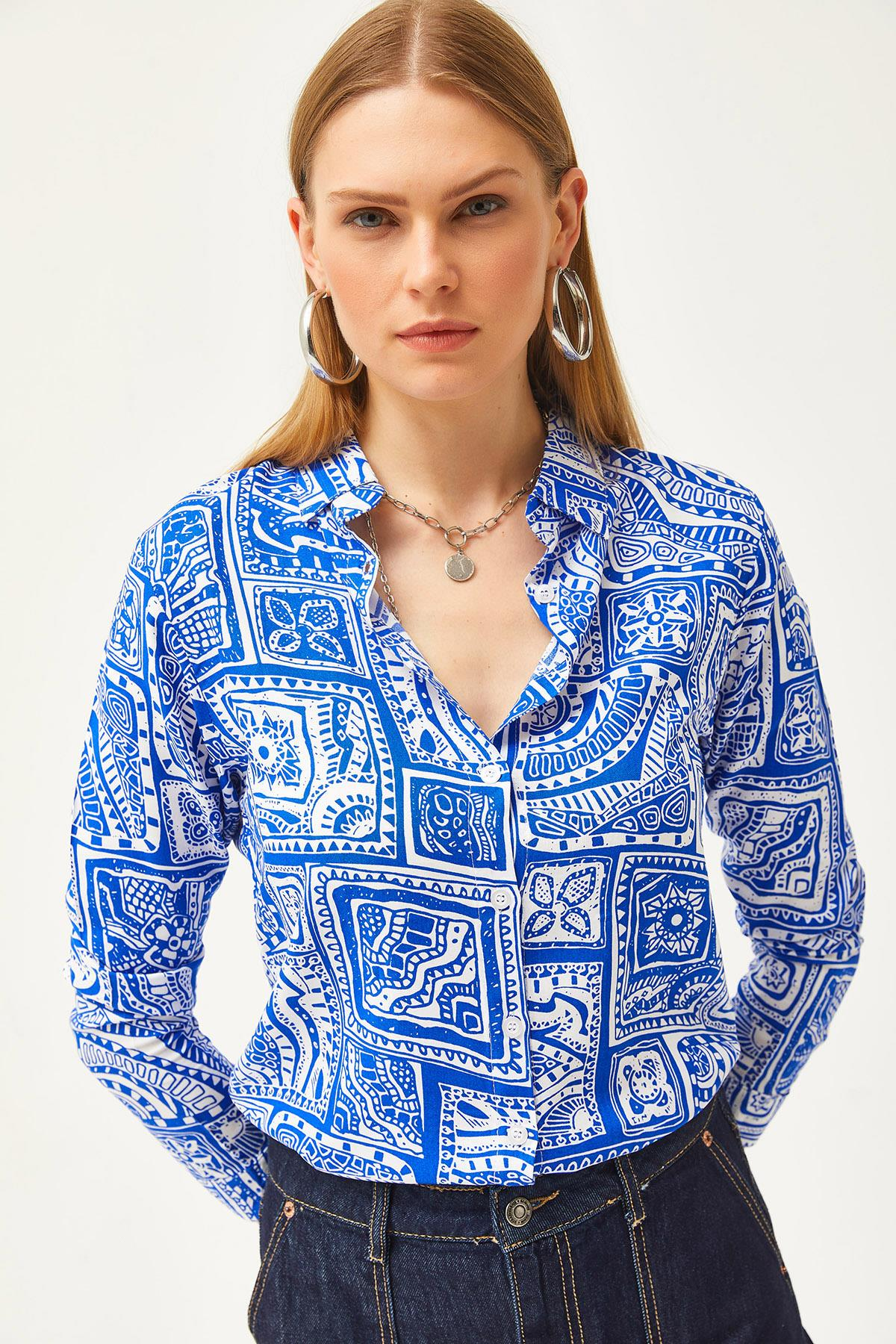 Patch Desenli Dokuma Viskon Gömlek Saks Mavi