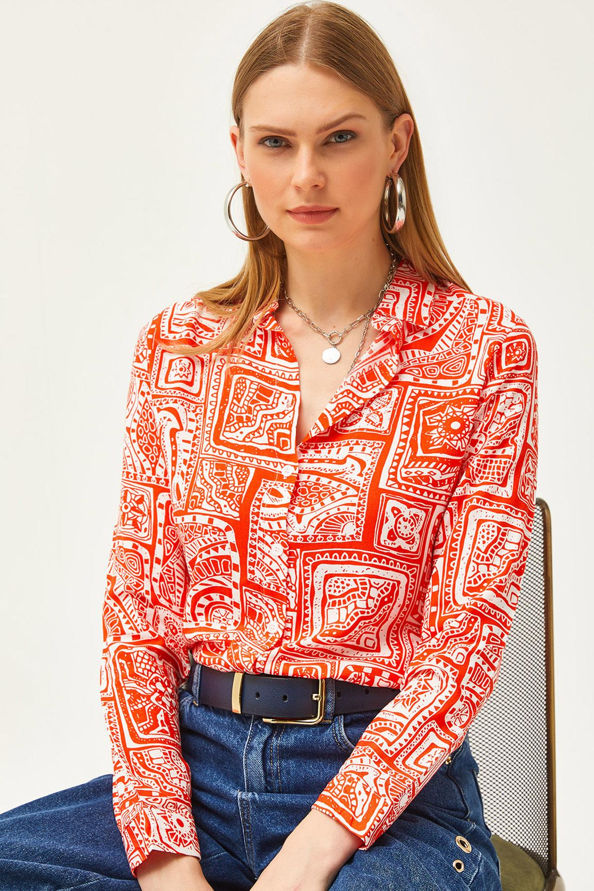 Patch Desenli Dokuma Viskon Gömlek Turuncu