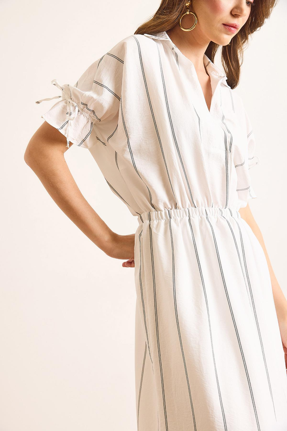 Polo Yaka Beli Lastikli Çizgili Astarlı Midi Dökümlü Elbise Beyaz (ELB-19002511)