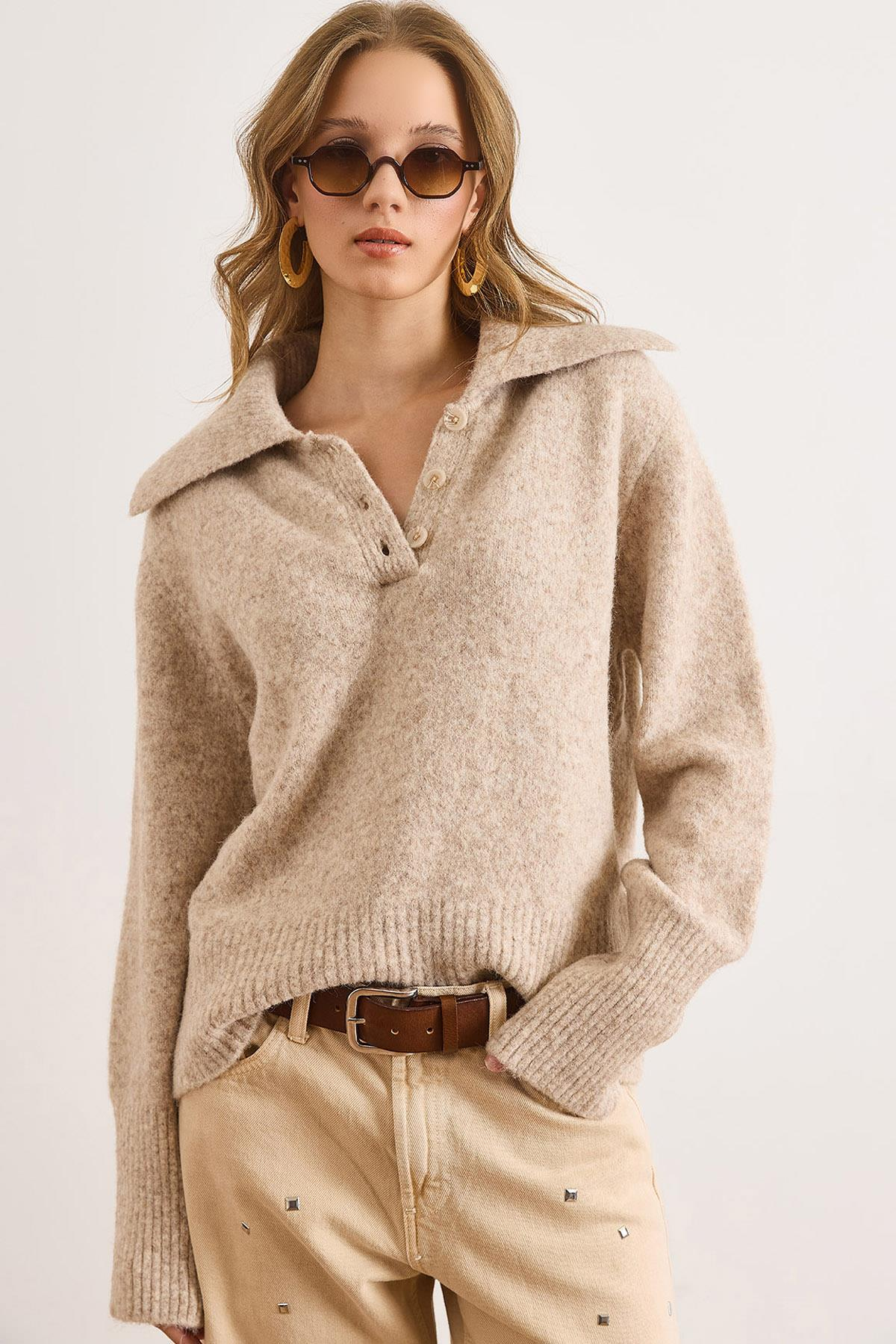 Polo Yaka Düğmeli Yumuşak Dokulu Triko Kazak Sütlü Kahve (KZK-19001016)
