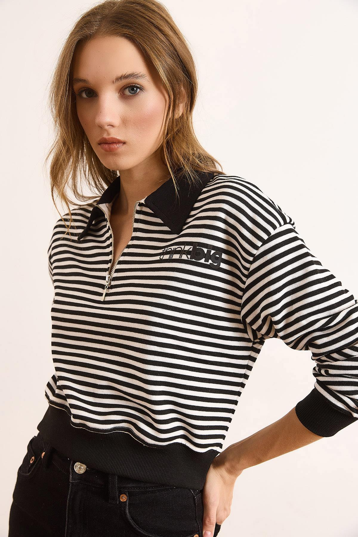 Polo Yaka Fermuarlı Çizgili Şardonsuz Crop Sweatshirt Siyah (SWT-19000746)