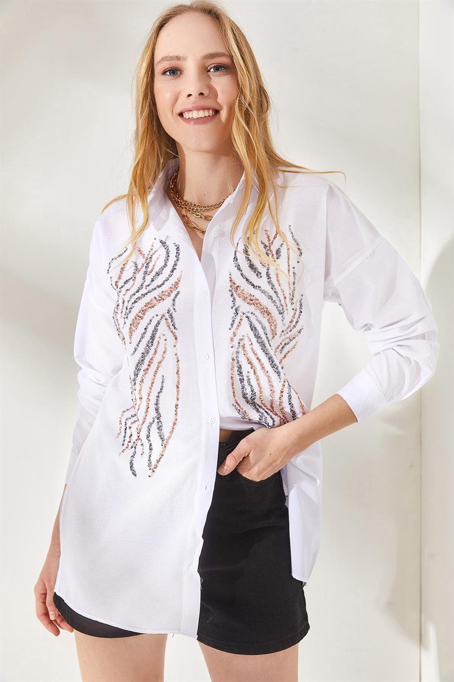 Pul Payet Detaylı Oversize Gömlek Beyaz (GML-19001106)