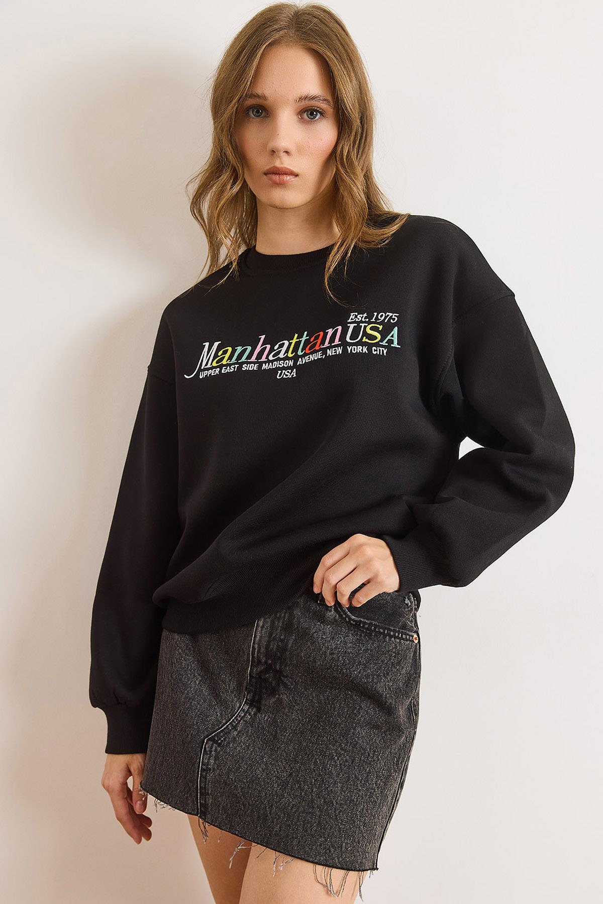 Renkli Nakışlı Şardonlu Sweatshirt Siyah (SWT-19000754)