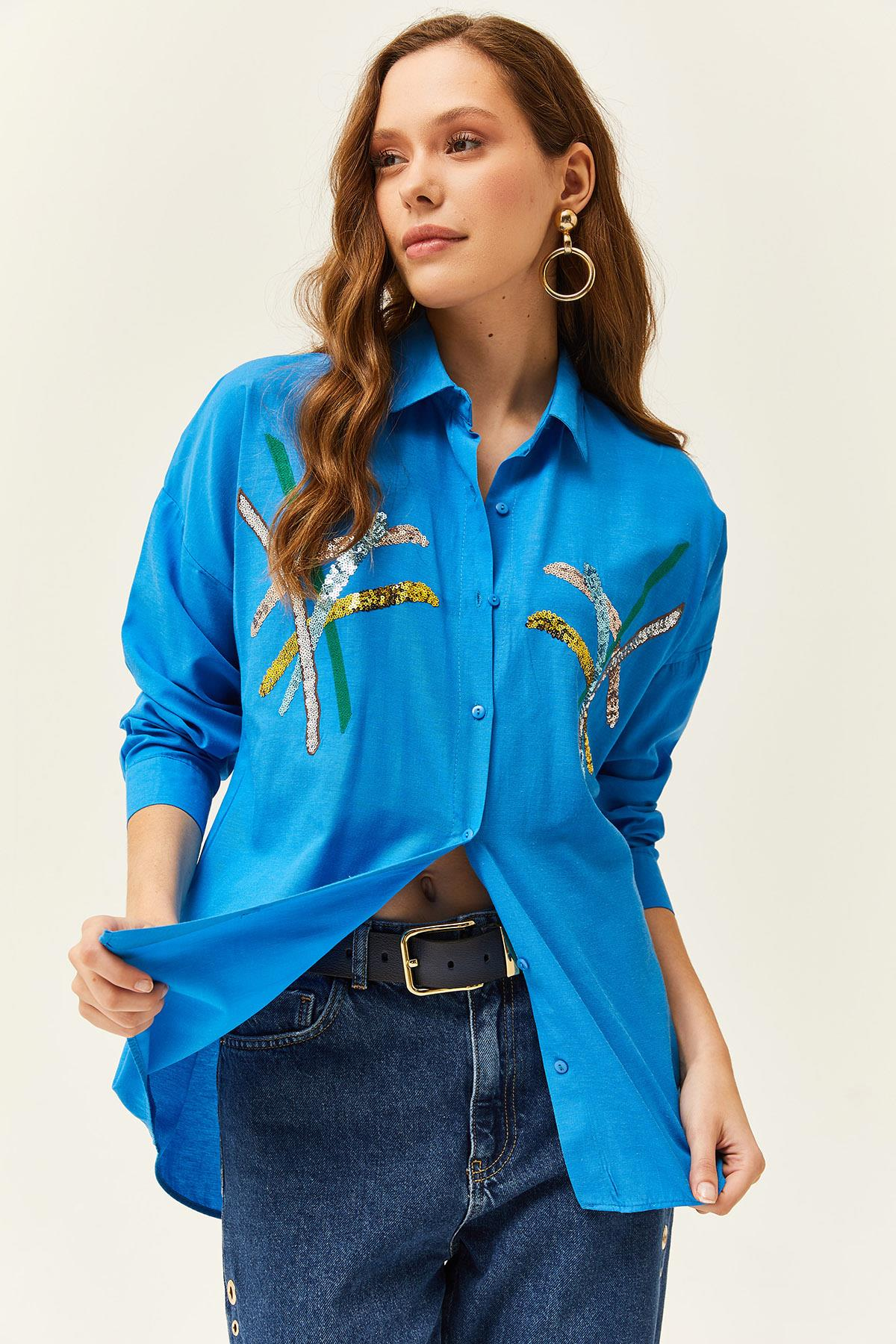 Renkli Payet Çubuklu Dokuma Gömlek Saks Mavi (GML-19001164)