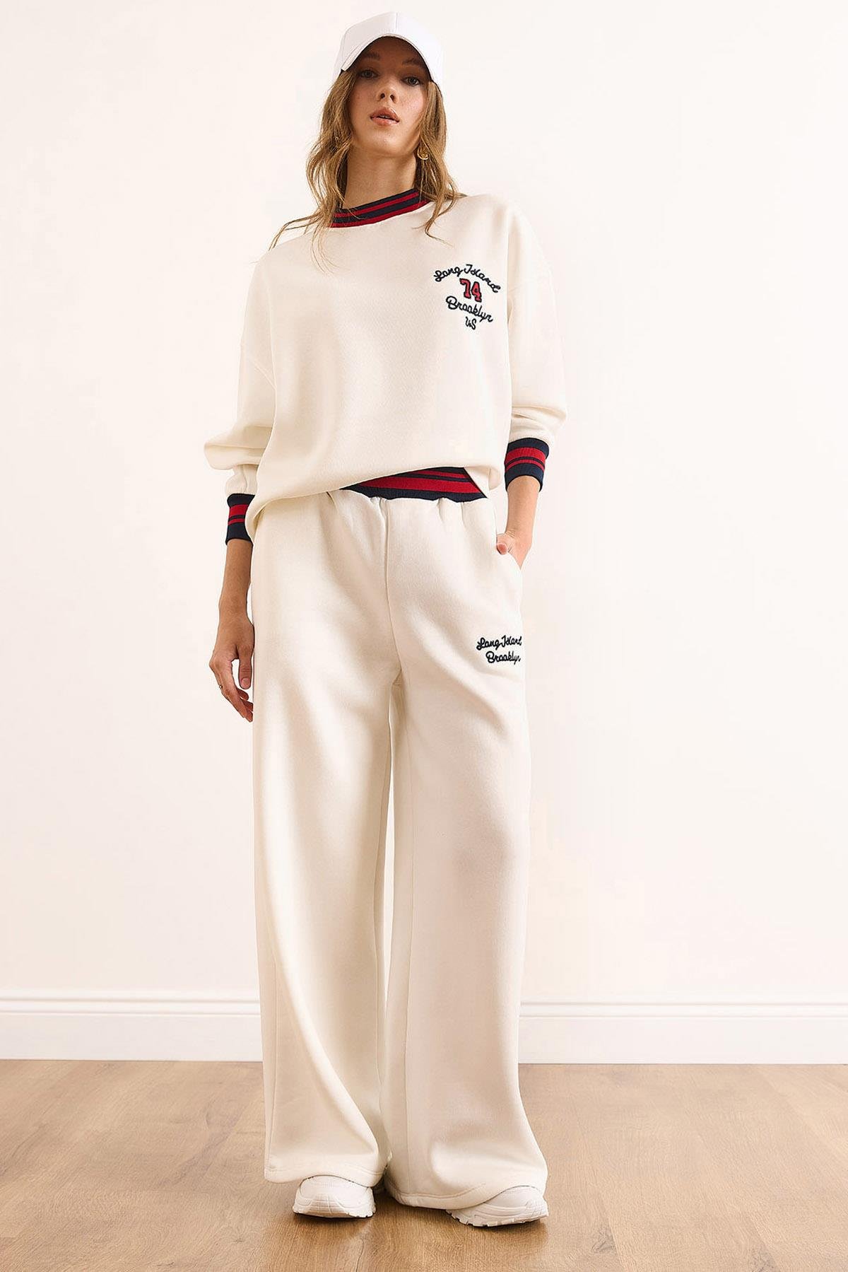 Şerit Detaylı Nakışlı Şardonlu Kalın Eşofman Takımı Beyaz