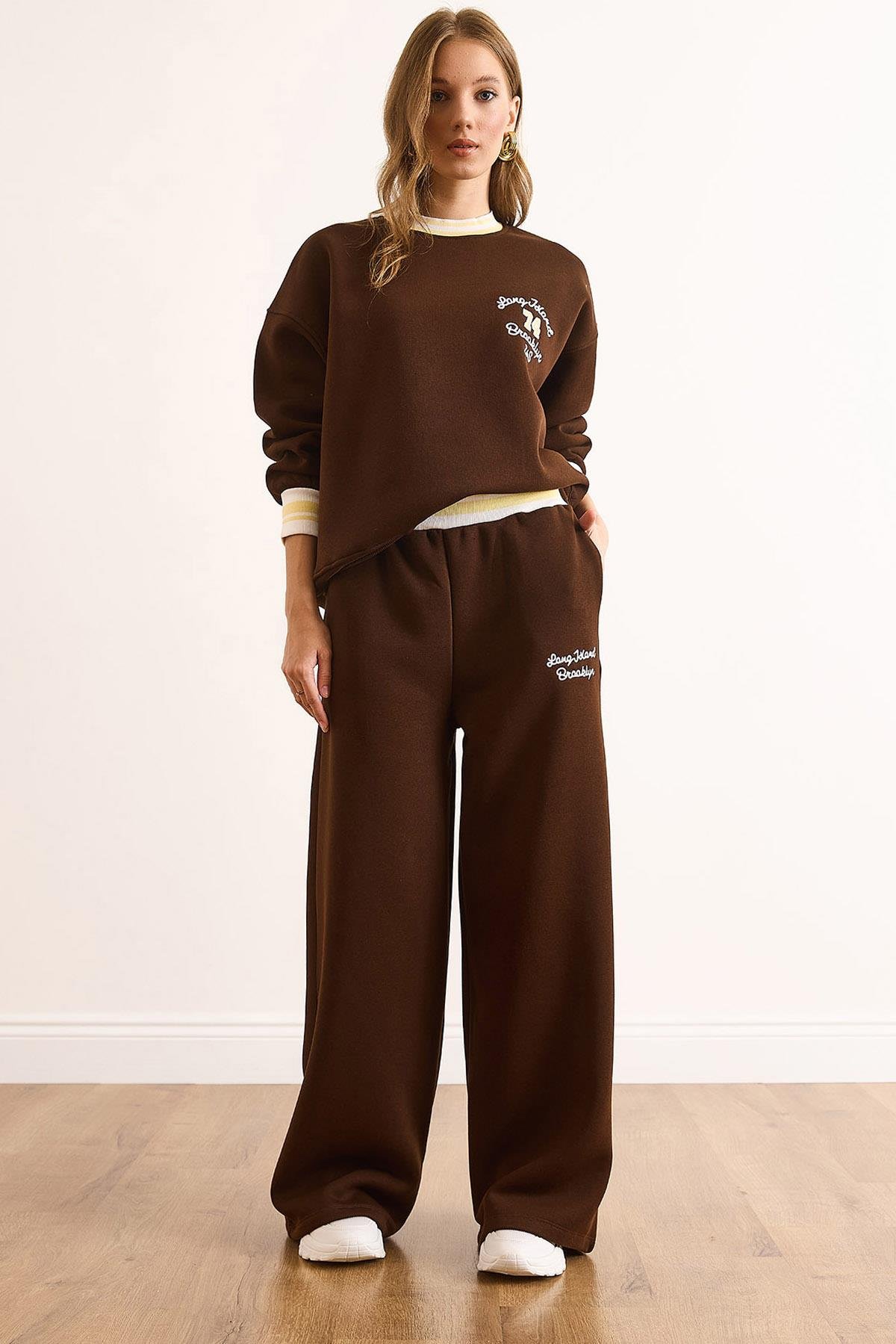 Şerit Detaylı Nakışlı Şardonlu Kalın Eşofman Takımı Kahverengi (ETKM-0000086)