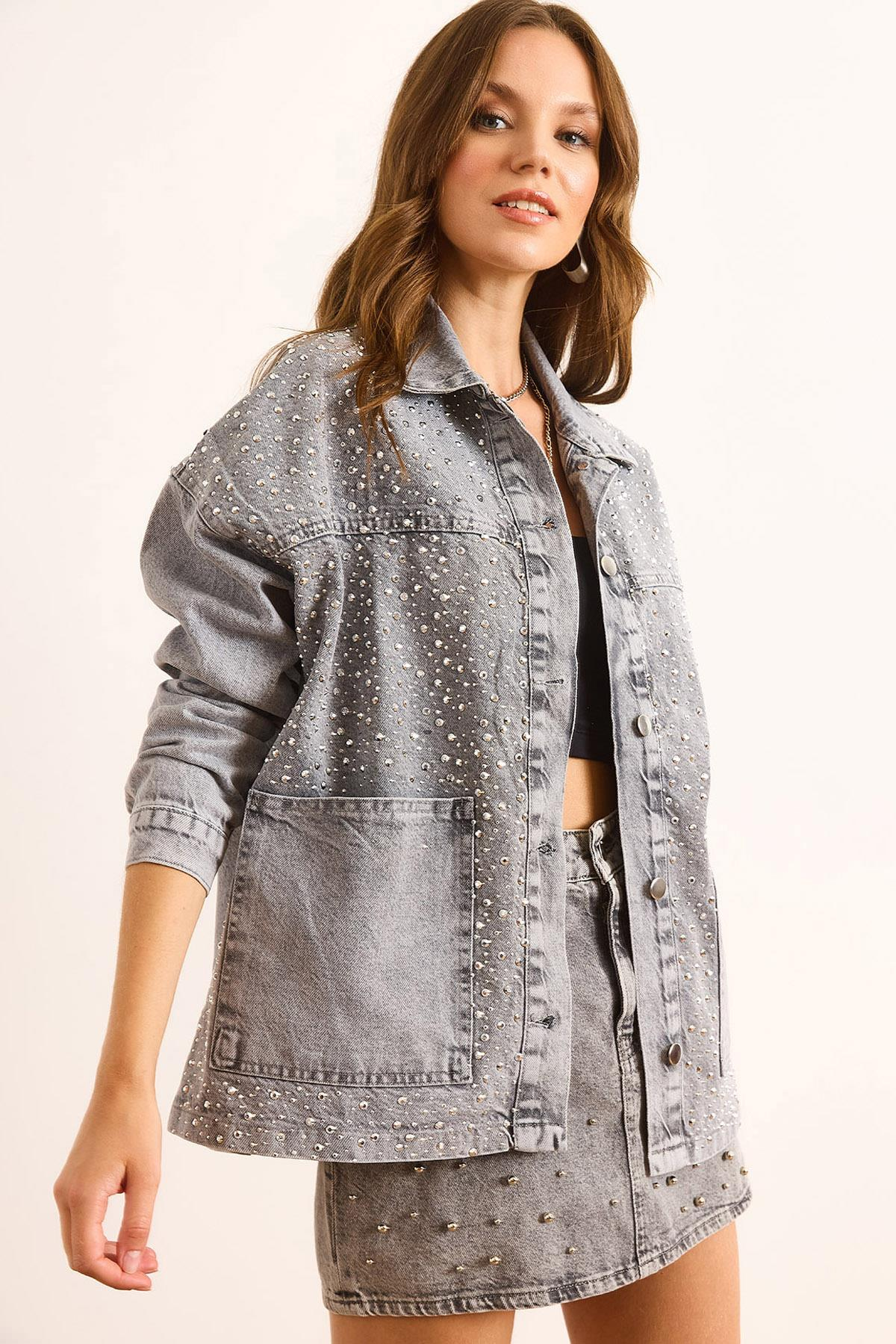 Serpme Taş Detaylı Cepli Denim Gömlek Ceket Gri (CKT-19000455)