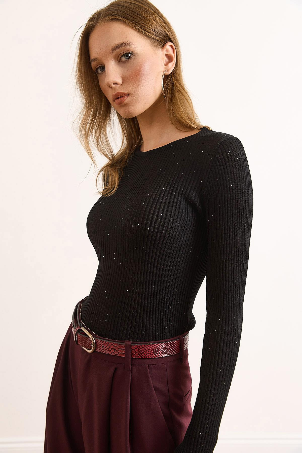 Simli Yarı Transparan İnce Triko Bluz Siyah (BLZ-19003106)