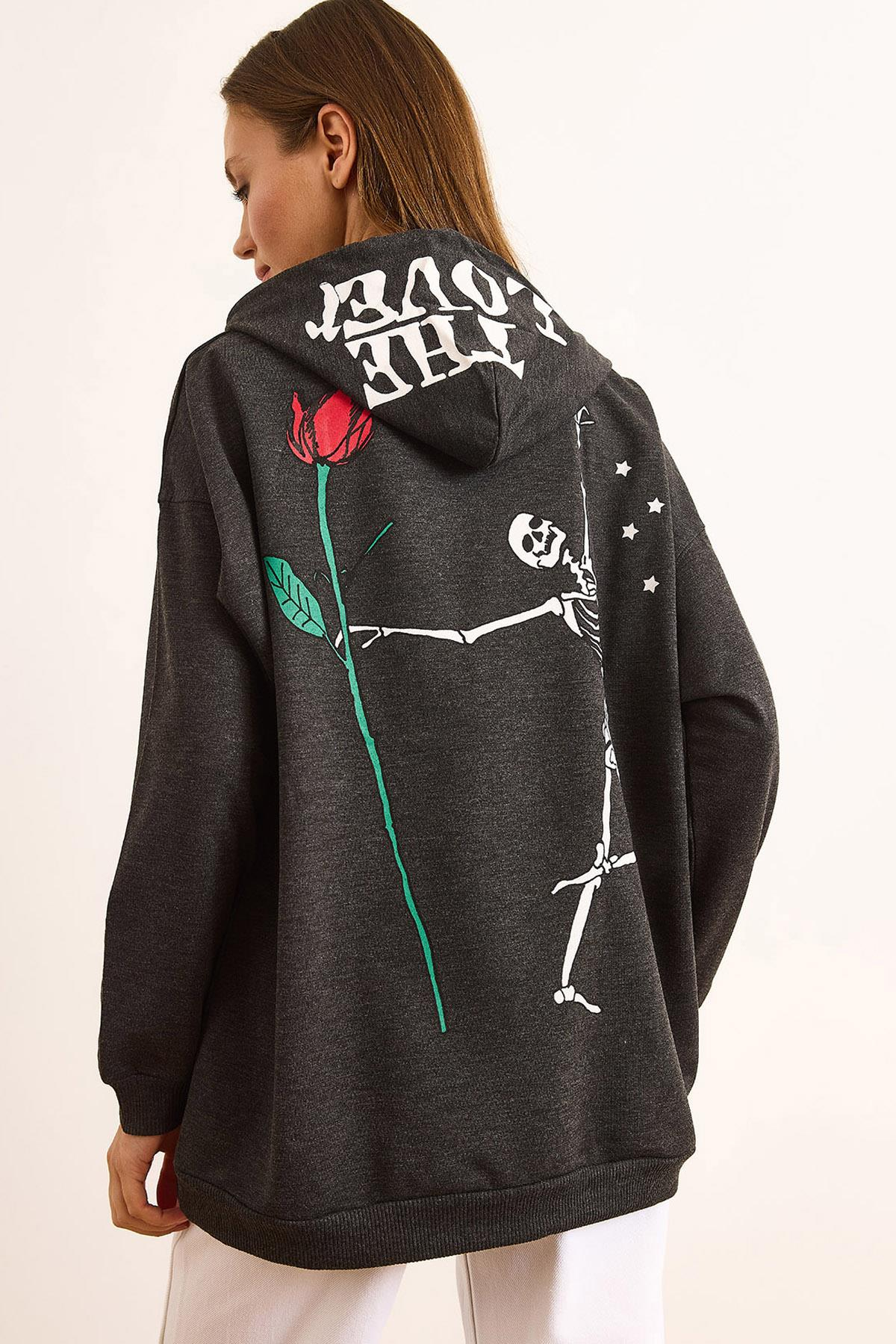 Sırtı İskelet Baskılı Kapüşonlu Oversize Sweatshirt Antrasit (SWT-19000723)