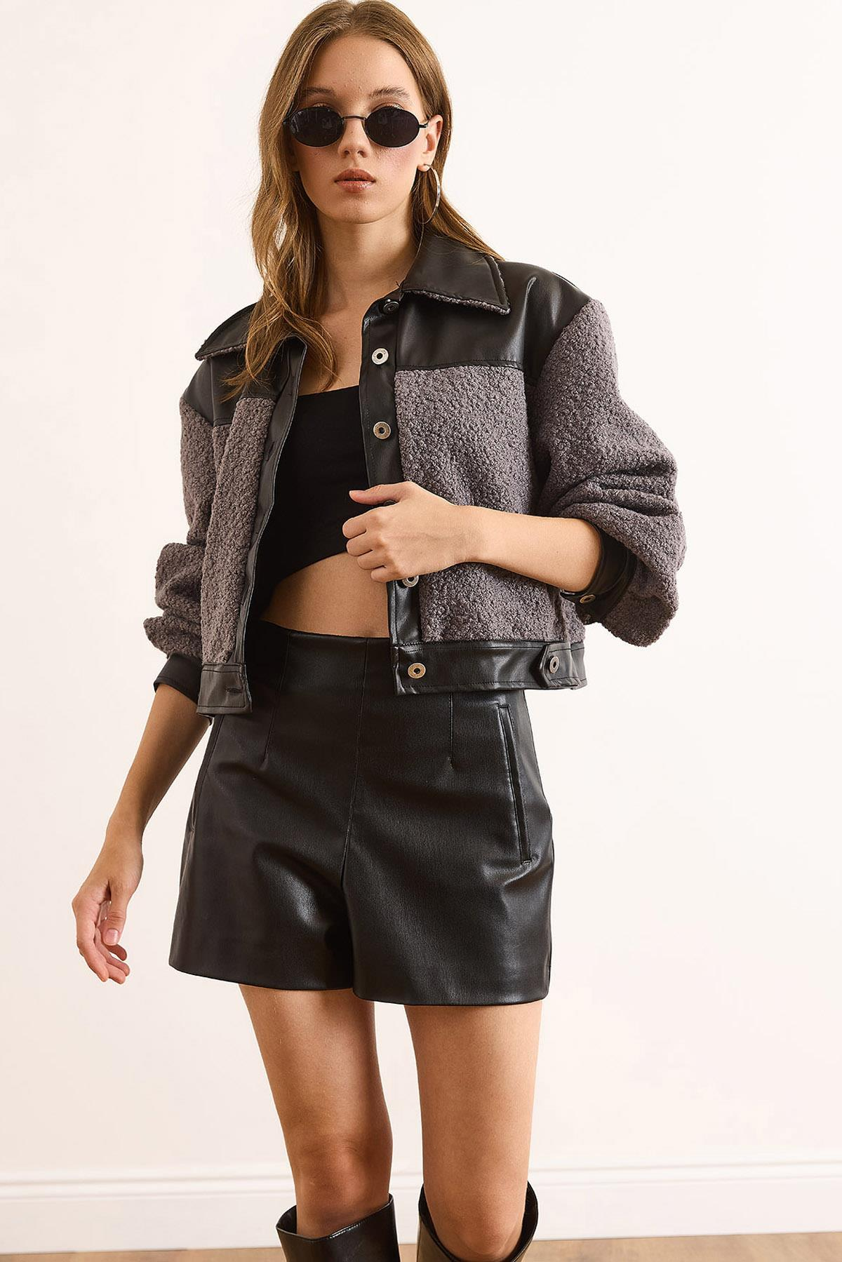 Suni Deri Garnili Astarlı Buklet Ceket Gri
