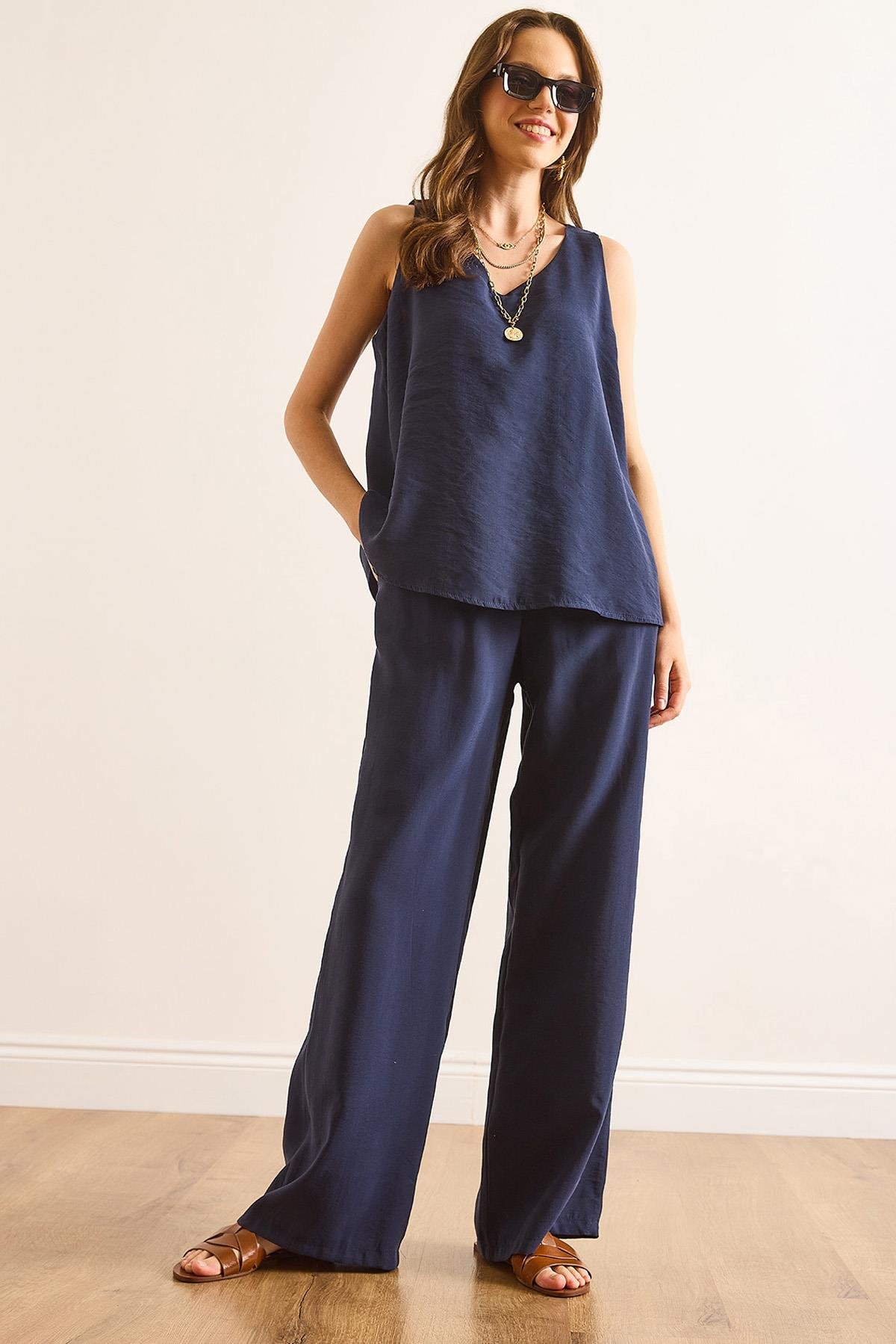 Üst V Yaka Çan Bluz Alt Cepli Pantolon Yumuşak Dokulu Takım Lacivert (TKM-19000413)