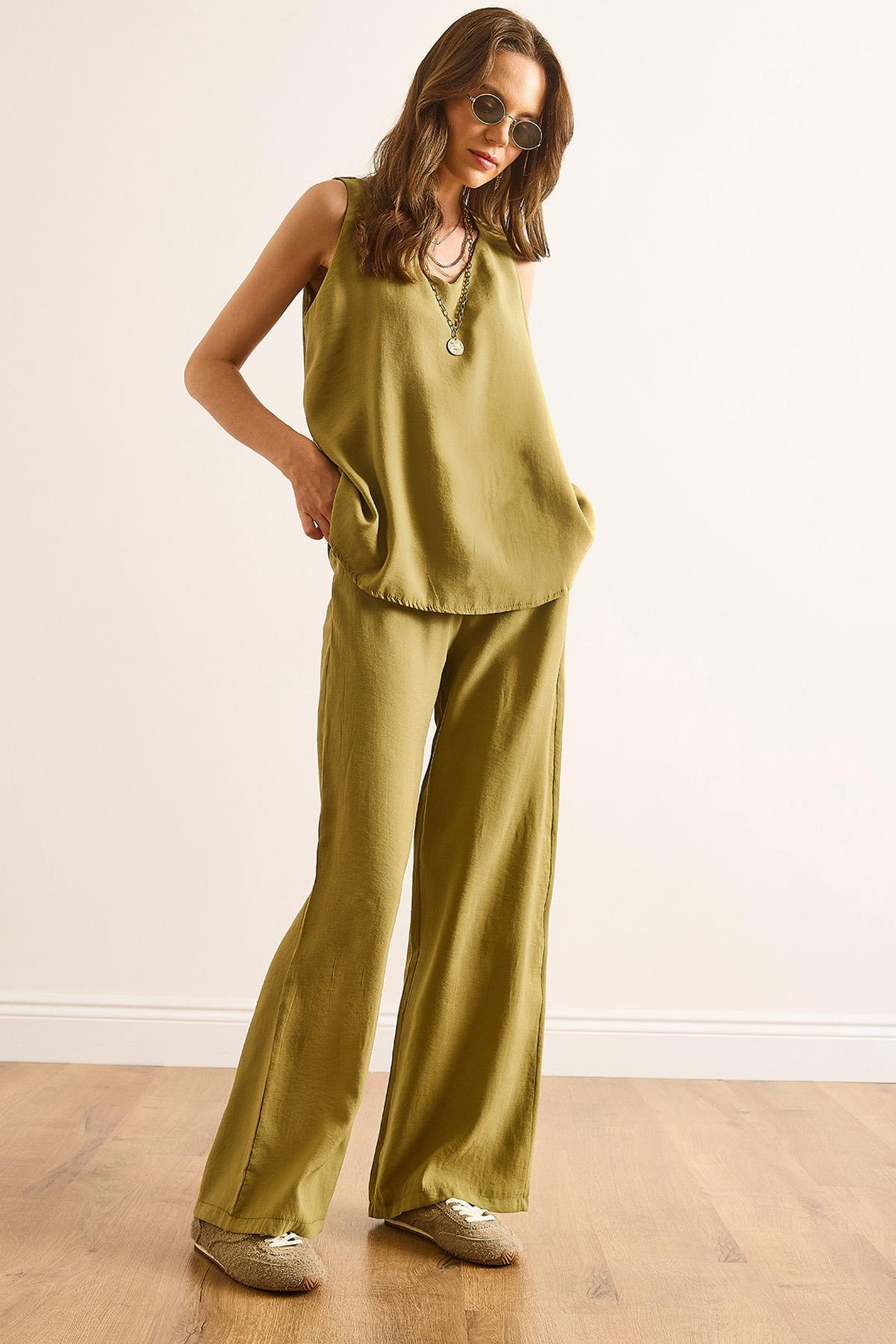 Üst V Yaka Çan Bluz Alt Cepli Pantolon Yumuşak Dokulu Takım Yağ Yeşili (TKM-19000413)