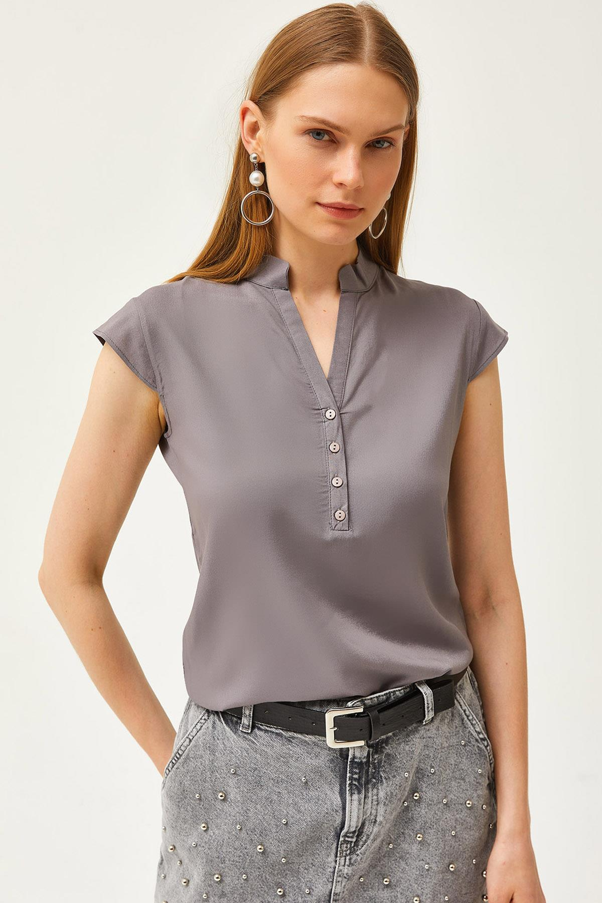 V Yaka 4 Düğmeli Viskon Bluz Gri (BLZ-19000279)