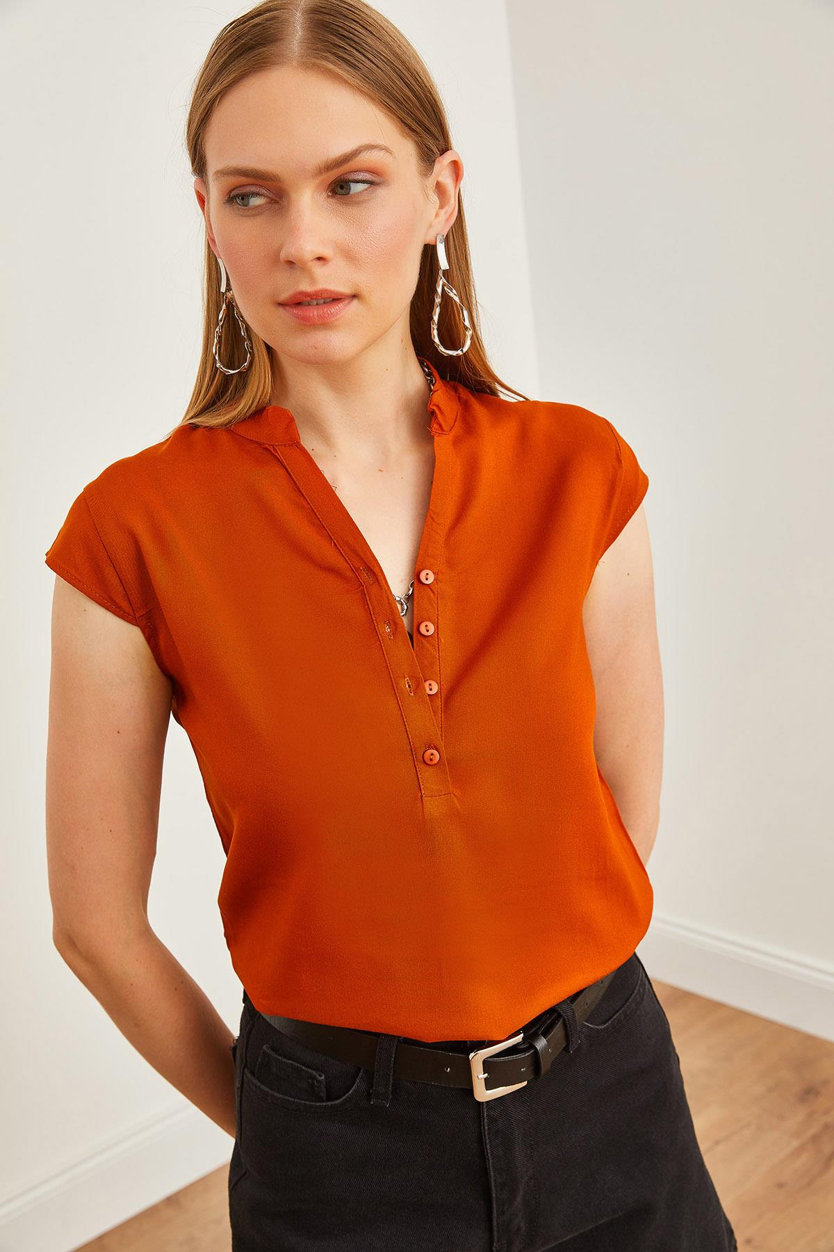 V Yaka 4 Düğmeli Viskon Bluz Kiremit (BLZ-19000279)