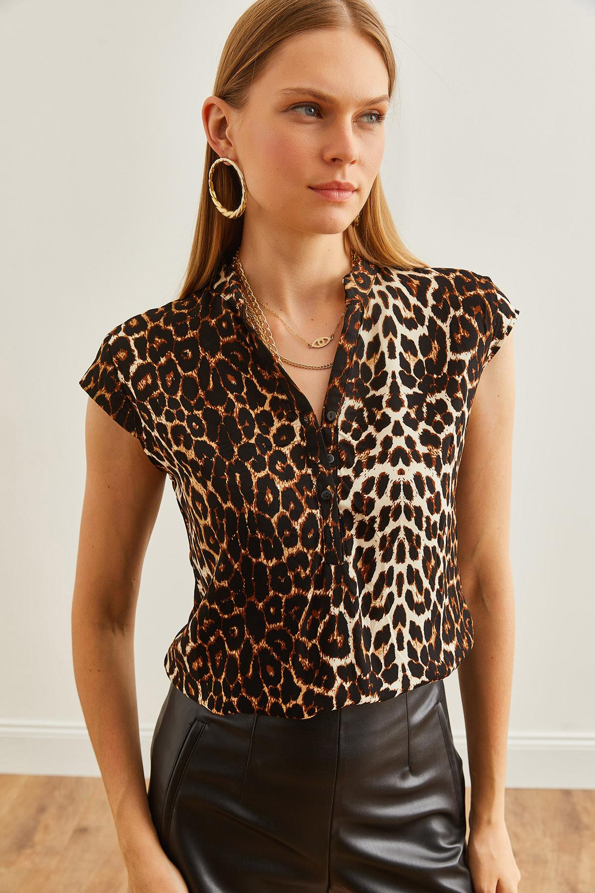 V Yaka 4 Düğmeli Viskon Bluz Taş Leopar (BLZ-19000279)