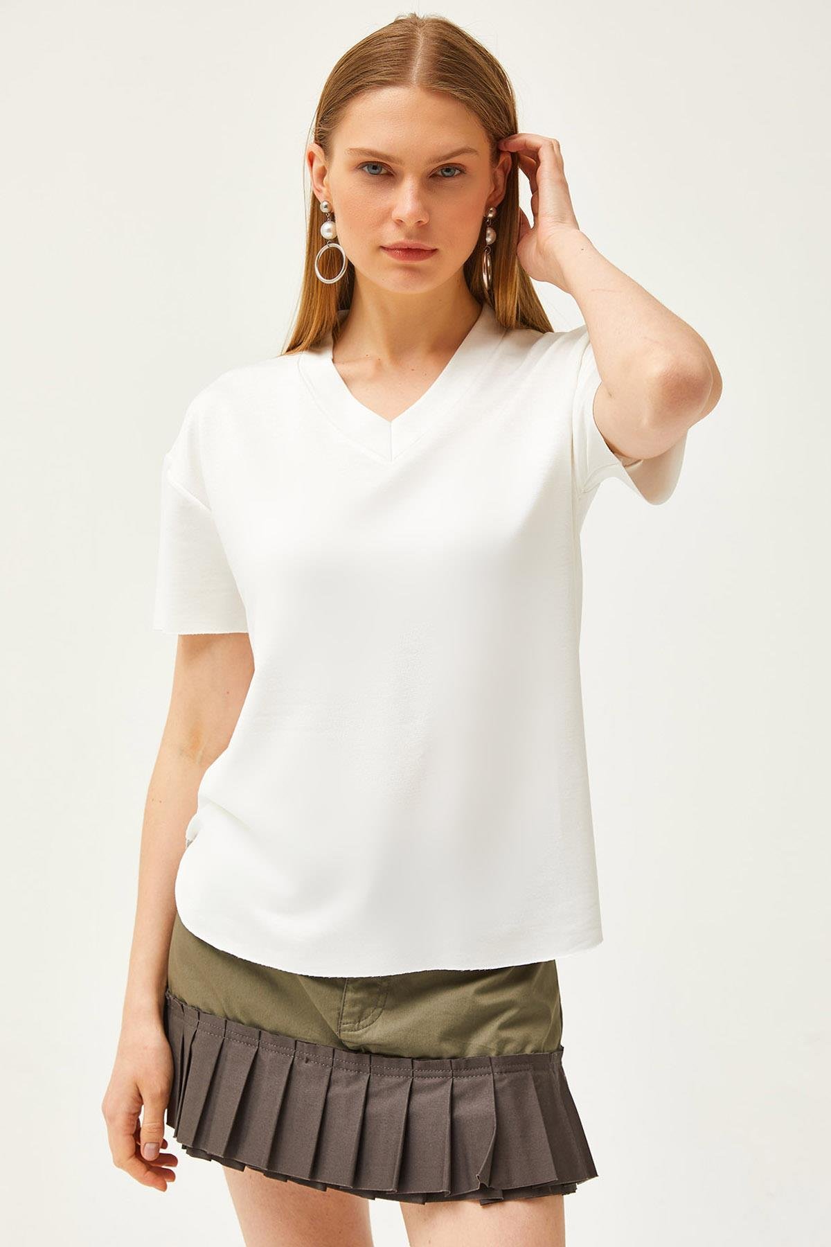 V Yaka Altı Oval Modal Tuşeli Tişört Ekru (TSH-19000804)