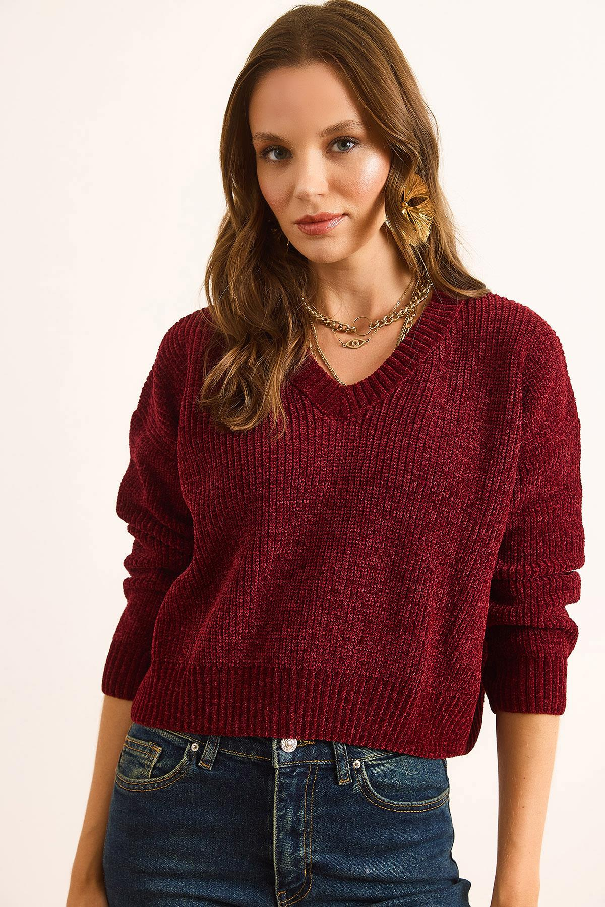V Yaka Şönil Yumuşak Dokulu Kazak Bordo (KZK-19000973)