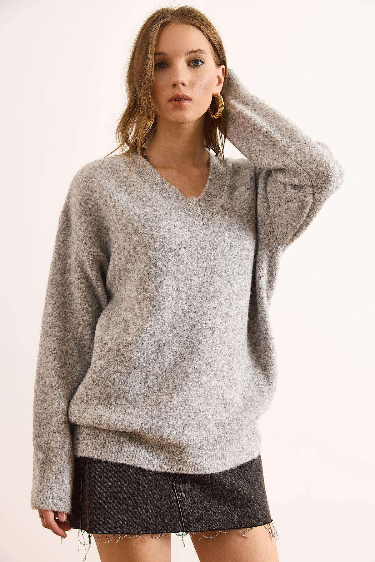 V Yaka Yumuşak Dokulu Relaxed Fit Kazak Gri (KZK-19000993)