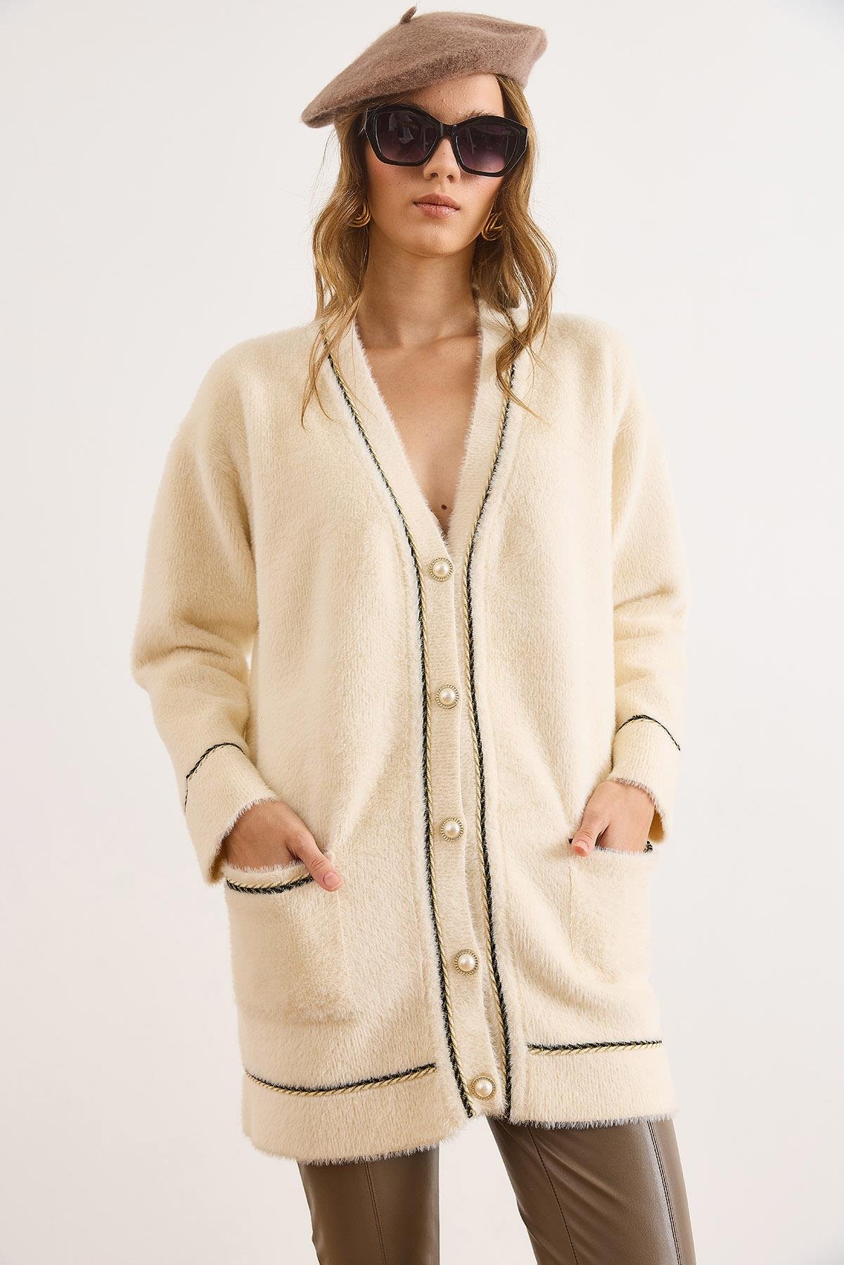 Varak İp Detaylı Kalın Cepli Uzun Sakal Hırka Ekru (HRK-19000408)