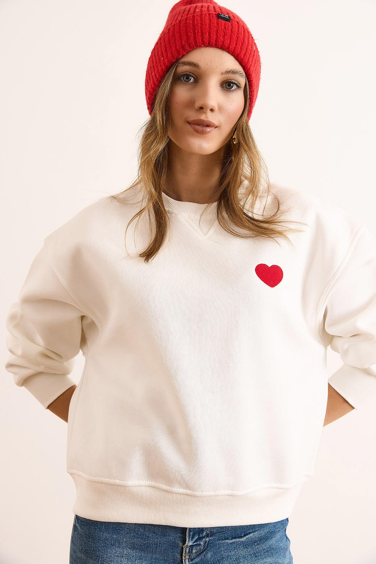 Yaka Detaylı Kalp Nakışlı Şardonlu Kalın Sweatshirt Beyaz (SWT-19000741)