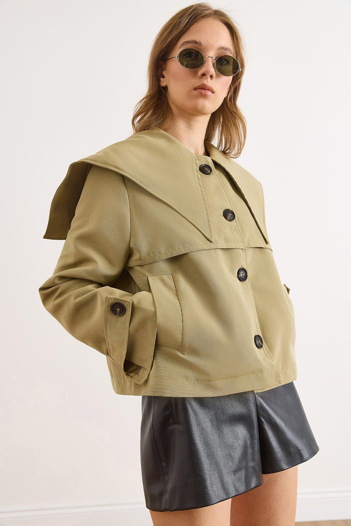 Yaka Manşet Detaylı Cepli Crop Trençkot Açık Haki