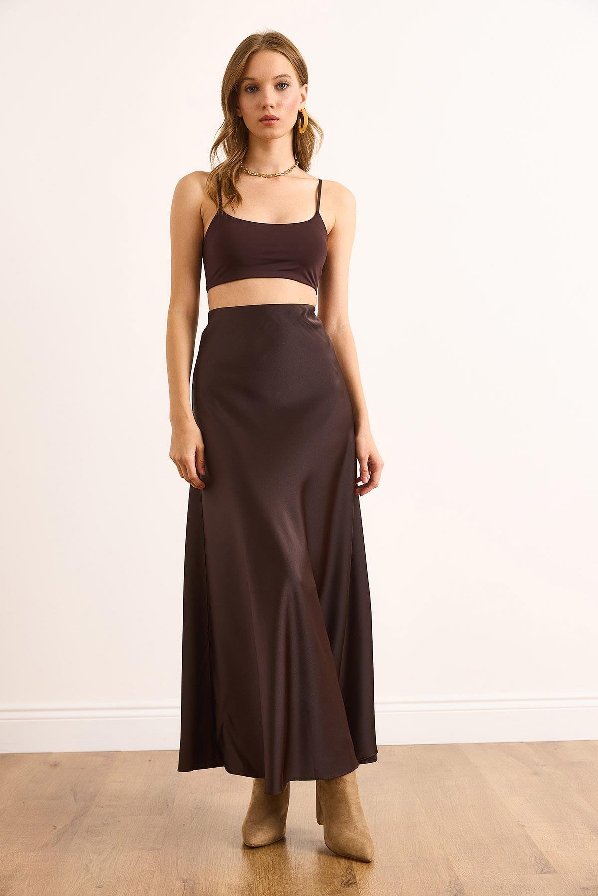 Yanı Fermuarlı Maxi Çan Dökümlü Saten Etek Acı Kahve (ETK-19000351)