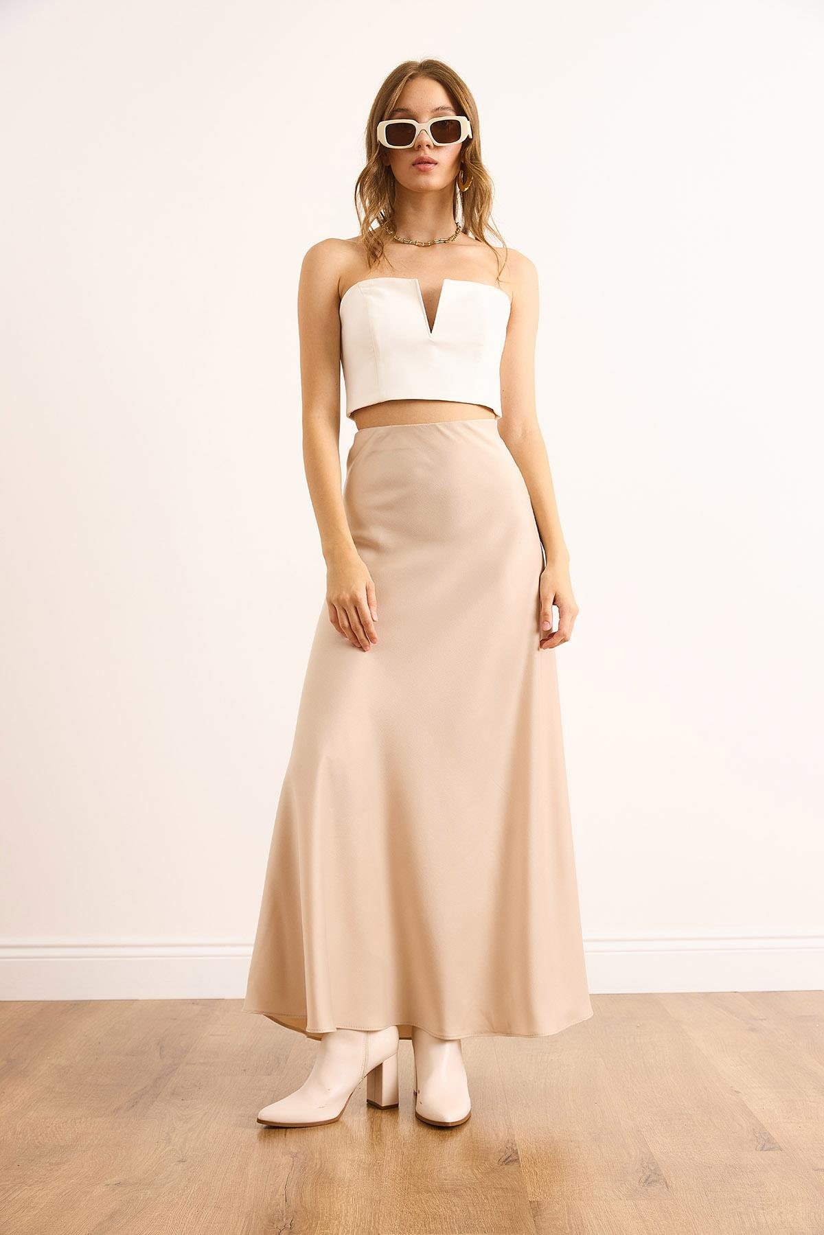 Yanı Fermuarlı Maxi Çan Dökümlü Saten Etek Bej