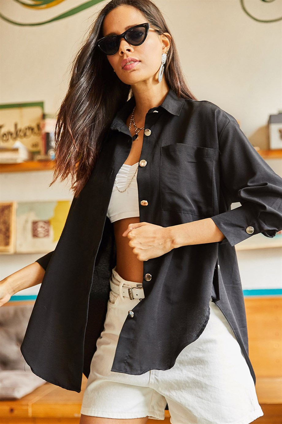 Yanları Düğme Detaylı Oversize Dokuma Gömlek Siyah (GML-19001004)