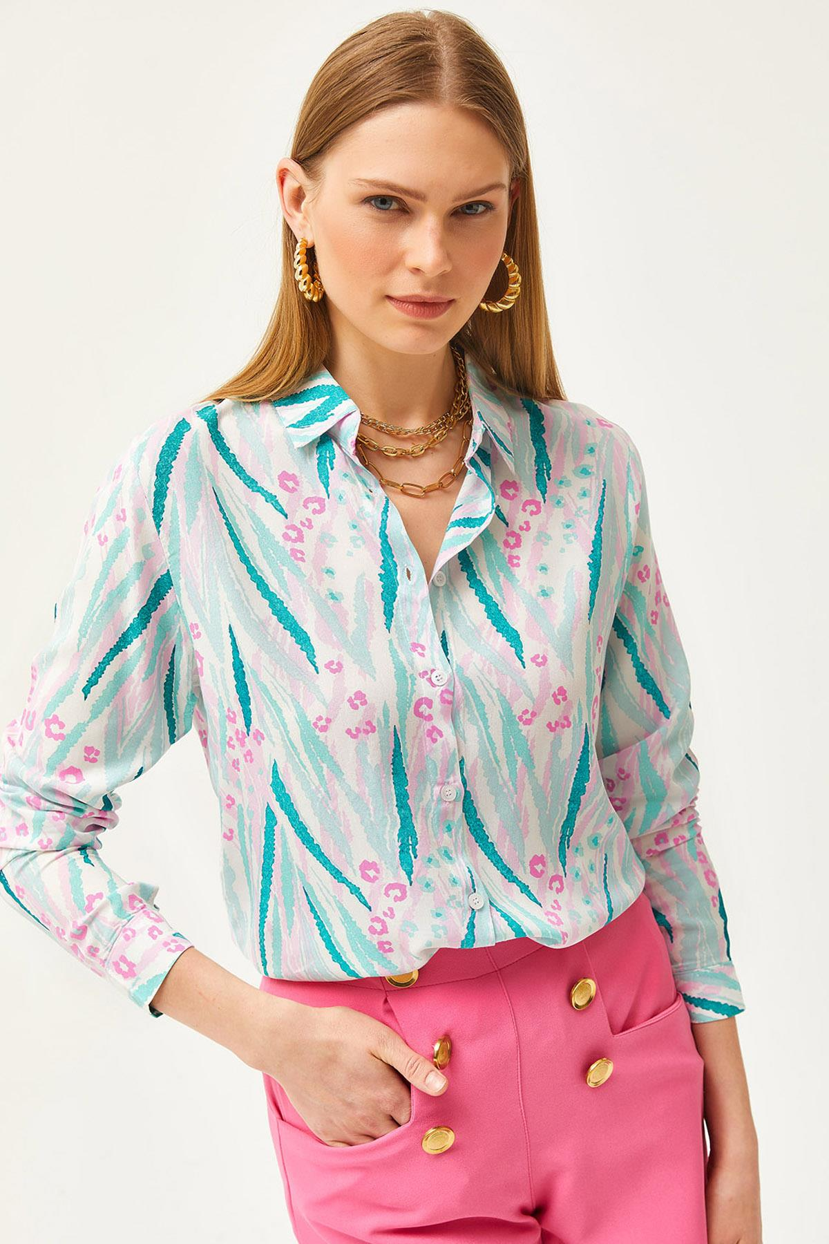 Yaprak Desenli Dokuma Viskon Gömlek Yeşil Pembe (GML-19001188)