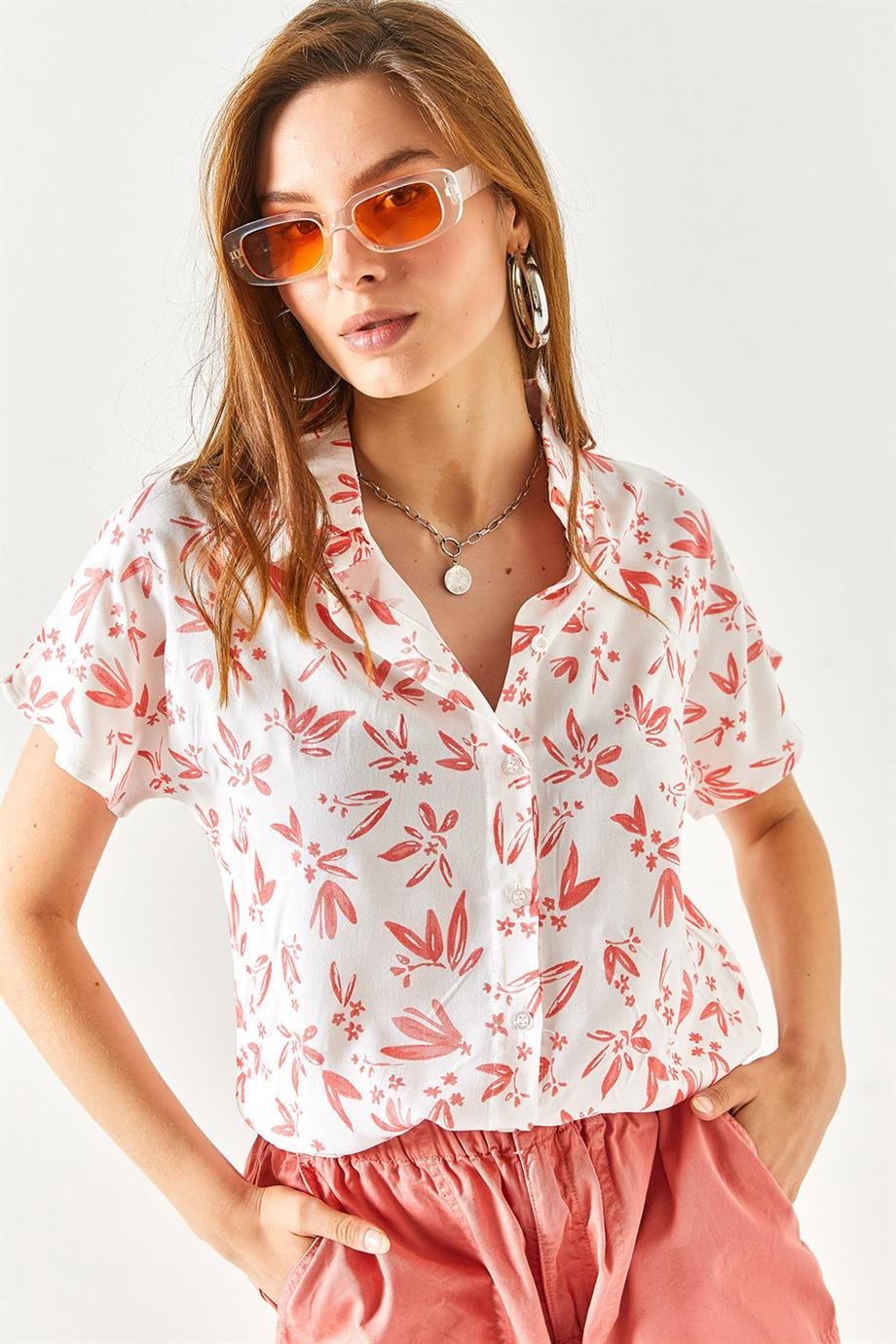 Yarasa Desenli Dokuma Viskon Gömlek Çiçekli Turuncu (GML-19001131)