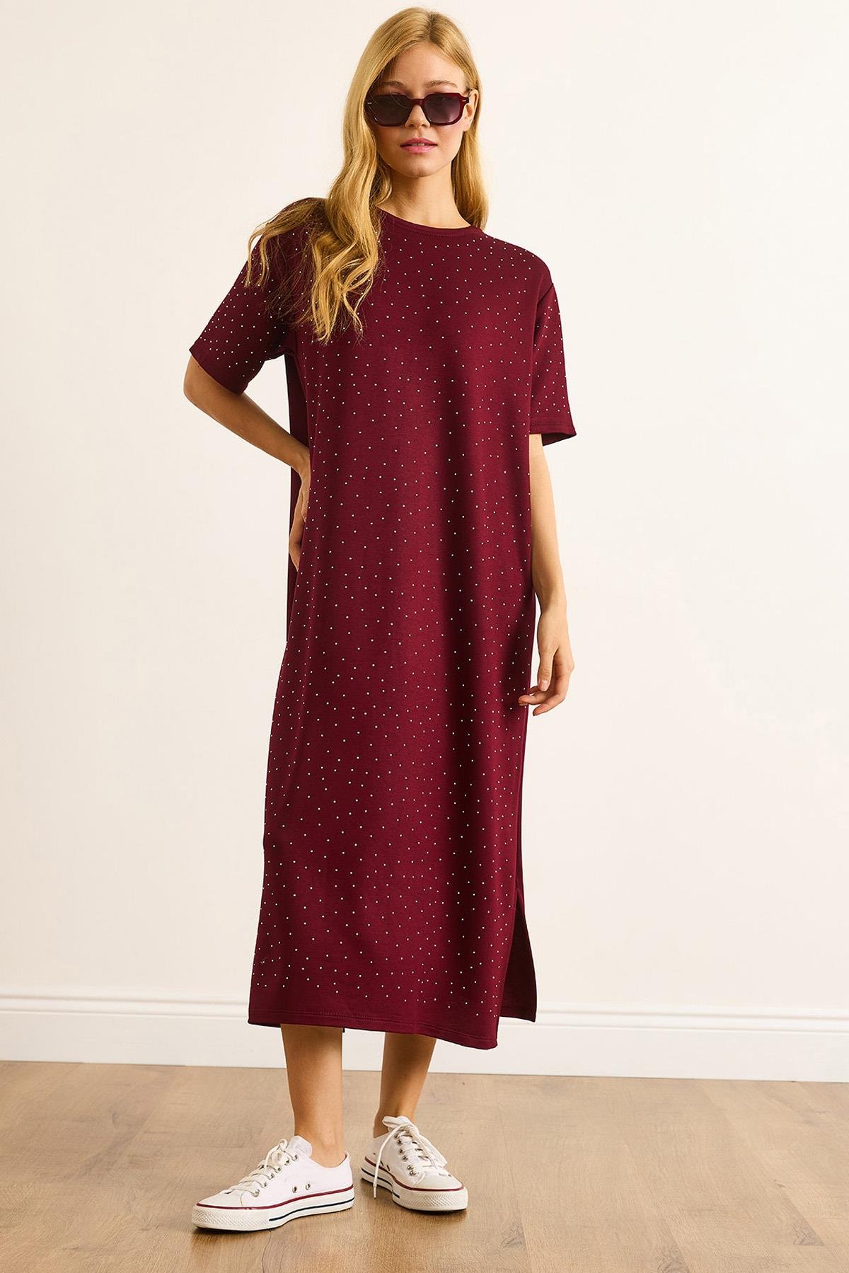 Yırtmaçlı Payet Detaylı Dökümlü Elbise Bordo (ELB-19002483)