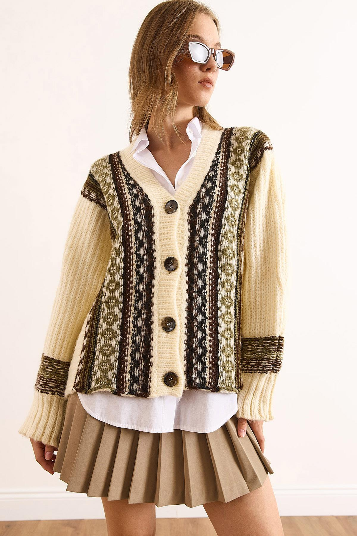 Yumuşak Dokulu Desenli Oversize Triko Hırka Ekru Yeşil (HRK-19000391)